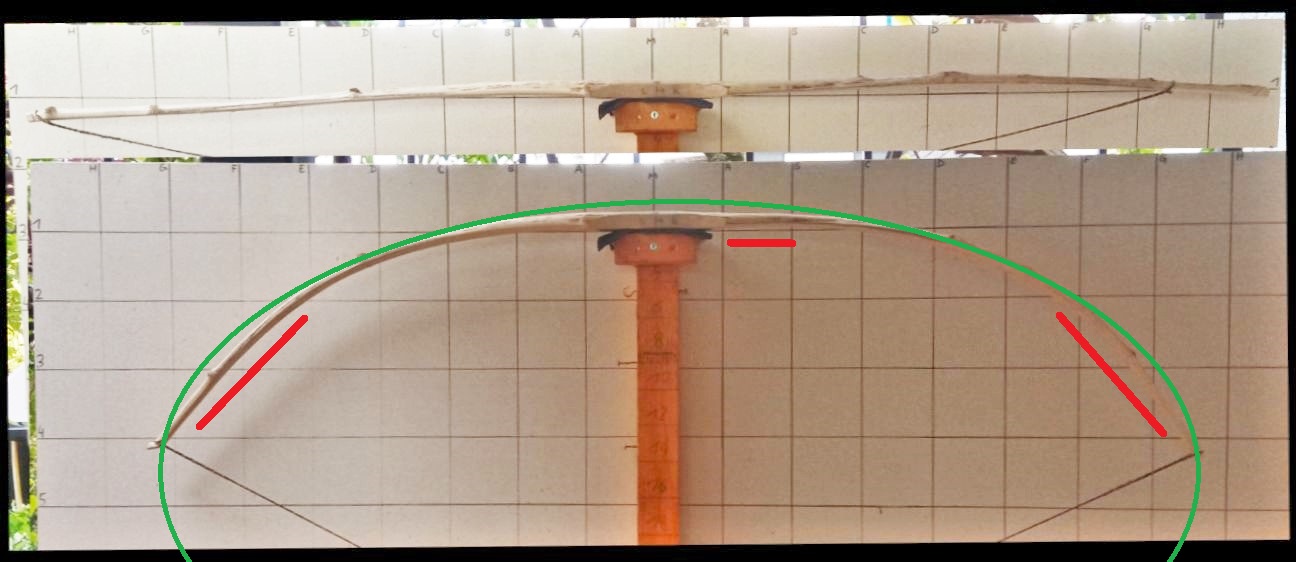 die andere Hälfte von dem Hartriegel-Stämmchen sollte auch ein Bogen werden. Die Grundform hat verschiedene leicht reflexe und deflexe Stellen. Nichts wildes, aber mein Auge und die nachträgliche Analyse einigen sich nicht. Also ich habe den Bogen ohne PC getillert, eher mit Hilfslinien drauf, danach mal am PC geschaut. Das passte im Vergleich überraschend gut. Bei mehr Auszug aber dann nicht mehr. Hier sah es fies nach überlasteten Stellen aus, ich habe dann noch nachgearbeitet. Der linke war dann auf einmal schwächer. Den habe ich eingekürzt, dass er nun 2cm kürzer ist als der rechte.
