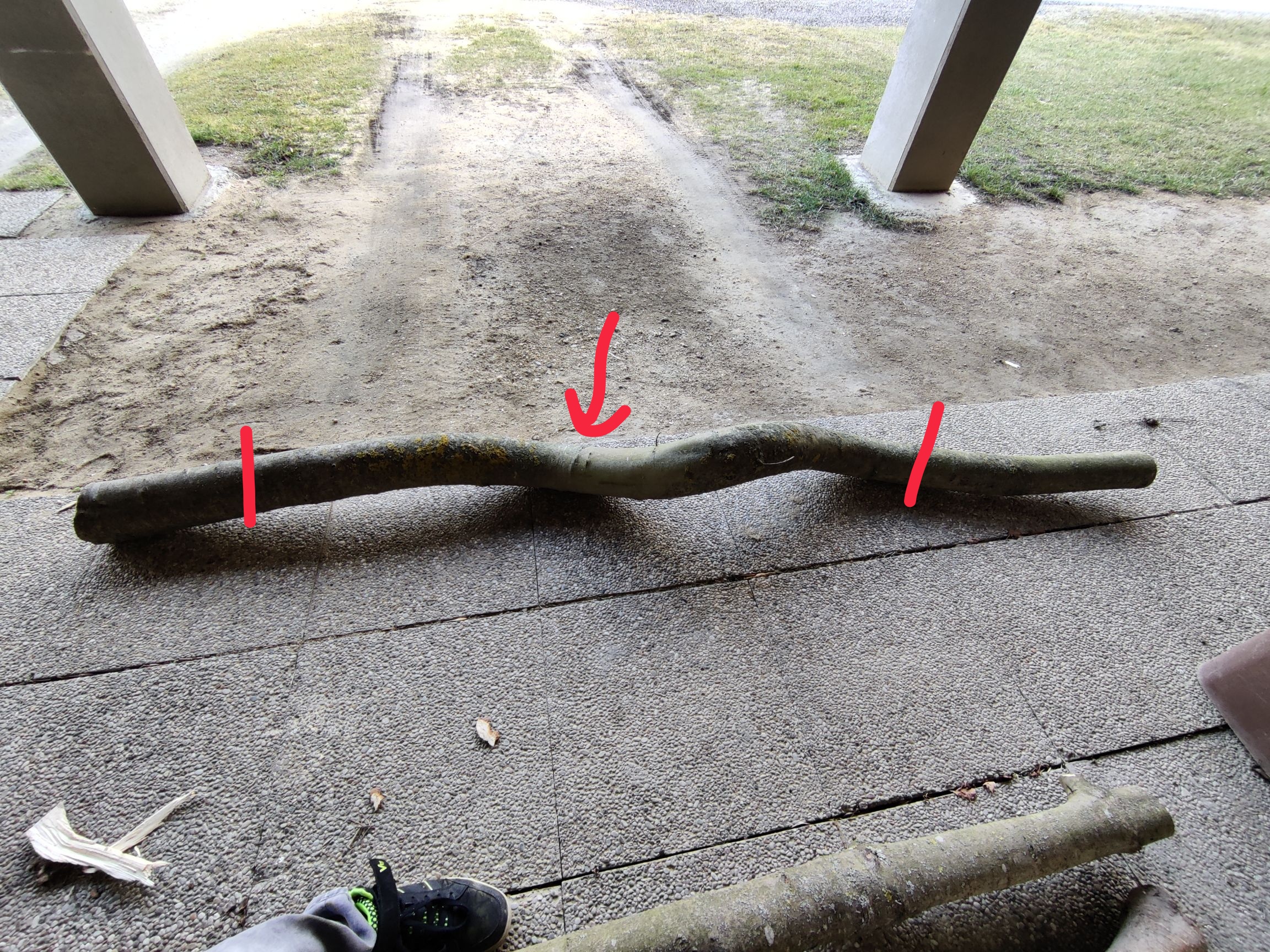 Ich hab ihn erstmal auf 2,6m abgeschnitten, so dass der geplante Griff ca auf halber Länge des Rohlings liegt. Ich will auf Nummer sicher gehen dass der nicht beim Trocknen schon stirbt. So kommen an beiden Enden noch jeweils etwa 40cm weg. Da hab ich Luft was das einreißen angeht. Momentan wäre der Plan, einen 1,7 - 1,8m langen Flachbogen oder HLD draus zu machen.