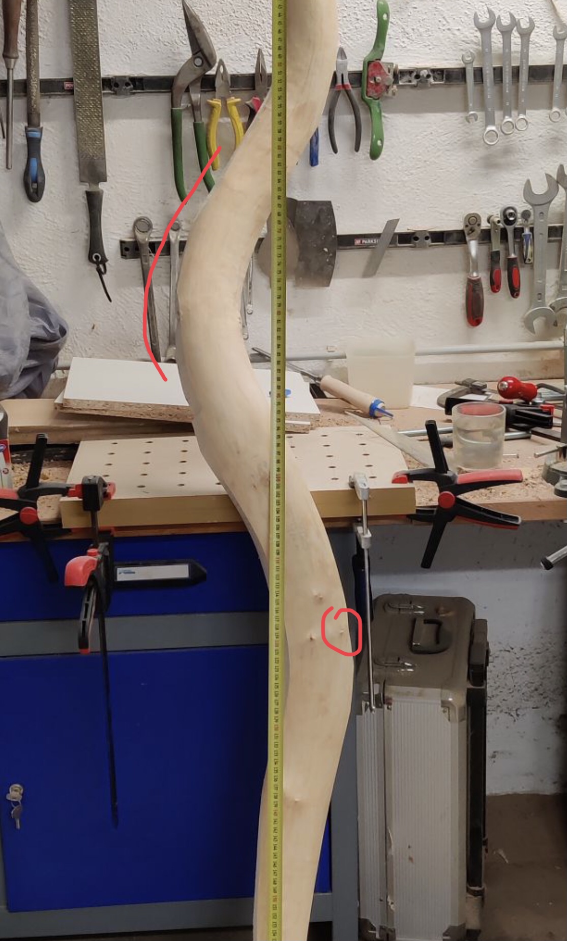 Was das trocknen angeht hab ich schon bei Basti um Rat gebeten. Da wäre jetzt der Plan ihn mal im ganzen unversiegelt für eine Woche austropfen zu lassen, dann die Rinde abmachen, bis zum Markkanal runter machen und die Enden versiegeln und auf ein Brett spannen. Dann Woche für Woche immer wieder mal was runtermessern und wieder aufspannen. Den Stamm der oberhalb meines Rohlings im Baum lag, hab ich mal versucht zu spalten. Der ist 1,7m lang und verdreht sich um ca 70-80°. Deshalb werde ich den Rohling nicht spalten sondern runtermessern und niederspannen.