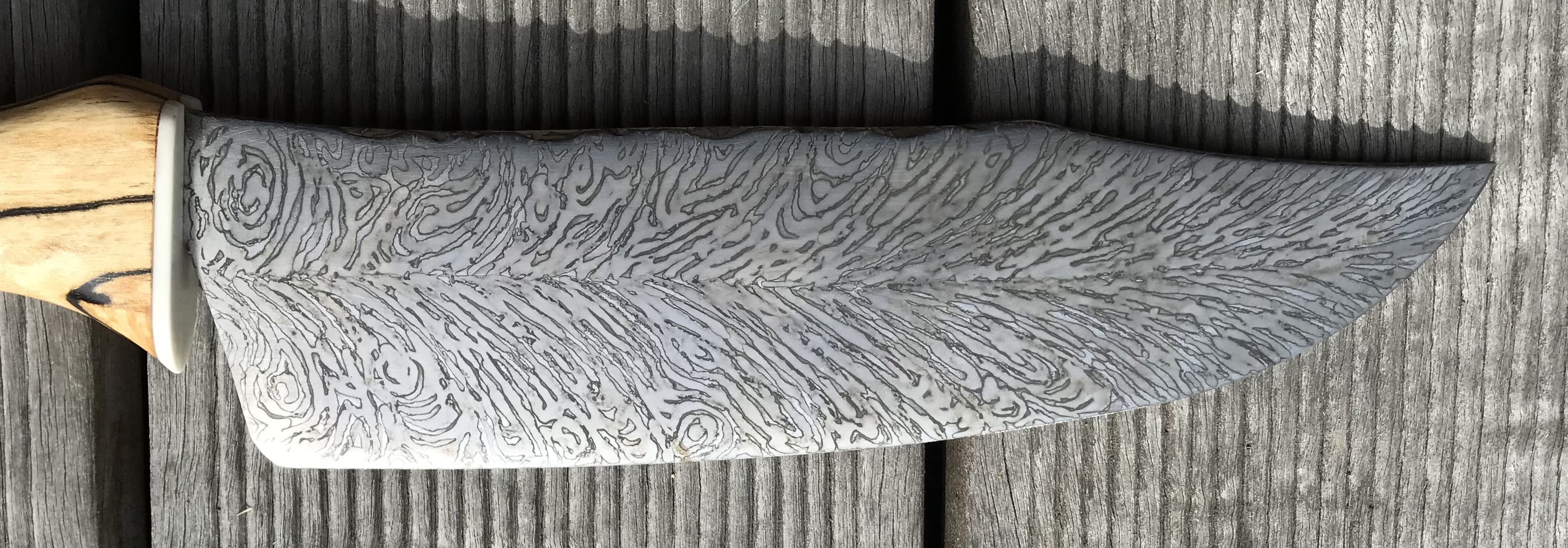 Habe mir für meinen Osagebogen ein Hackmesser um 39 Euro im Lagerhaus gekauft. Hat auch gut funktioniert aber, das Messer sieht einfach sch….. aus und so habe ich mir gedacht, ich könnte es etwas umarbeiten. Mit der Flex zurechtgetrimmt, geschliffen, neuer abnehmbarer Griff aus Maserbirke, vorne ein Blättchen aus Knochen. Die Klinge habe ich dann mit Estragon Senf geätzt. Gemalt habe ich mit einem Zahnstocher. Als Vorlage diente ein Federdamastmesser aus dem Internet.lG Stephan