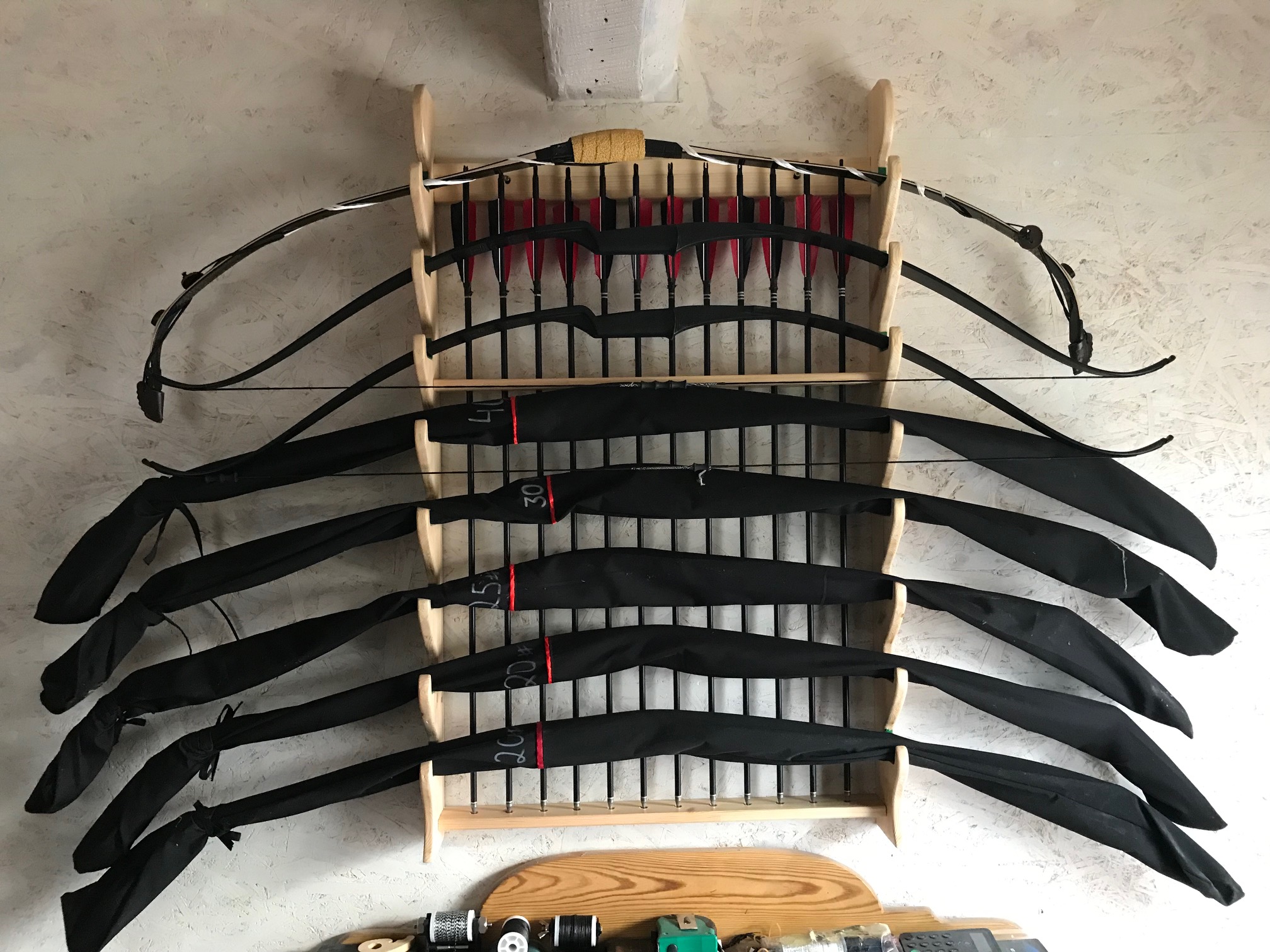 ich hab mir einen Bogenhalter für die Wandmontage aus einem alten Massivholz-Bettgestell gebaut.