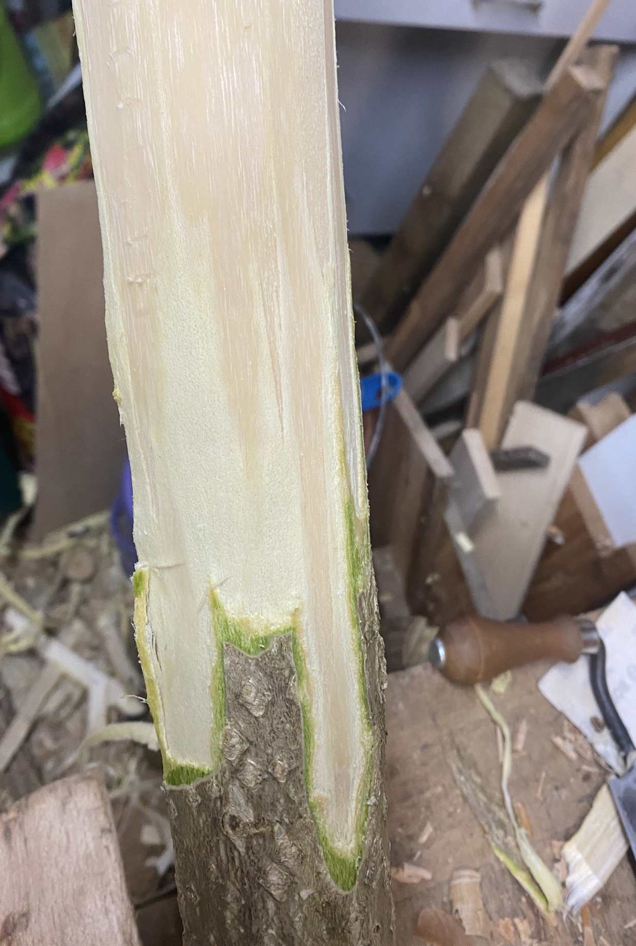 einen Götterbaummarkkanal gesehen hat. Reduzieren Schälen, interessant ist so eine weiche Schicht unter der Rinde, ein wenig wie im Markkanal. Und so sieht es nach 50 min dann aus.165 cm lang und bereit zum Trocknen. Ich bin ja so gespannt wie er trocknet. zwei Tage vor der Tür, dann zwei Tage im Vorraum, dannn schaunmermal...