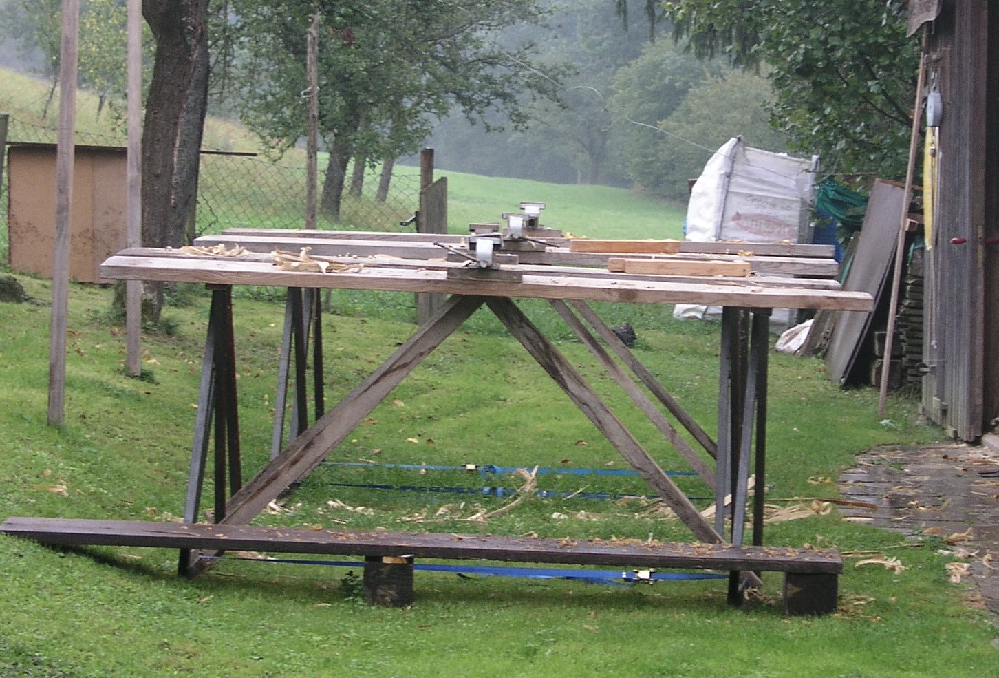 Ich geb meine Arbeitsplätze her. Diele, geschweißte C50 Profile als Auflage der Diele, 2 Diagonale Verstrebungshölzer, lediglich zum unteren Spannen braucht’s einen neuen Spanngurt. Der Schraubstock wird mittig aufgeschraubt und beide Auflager der WA‘e sind mit ner Schraubzwinge variabel.