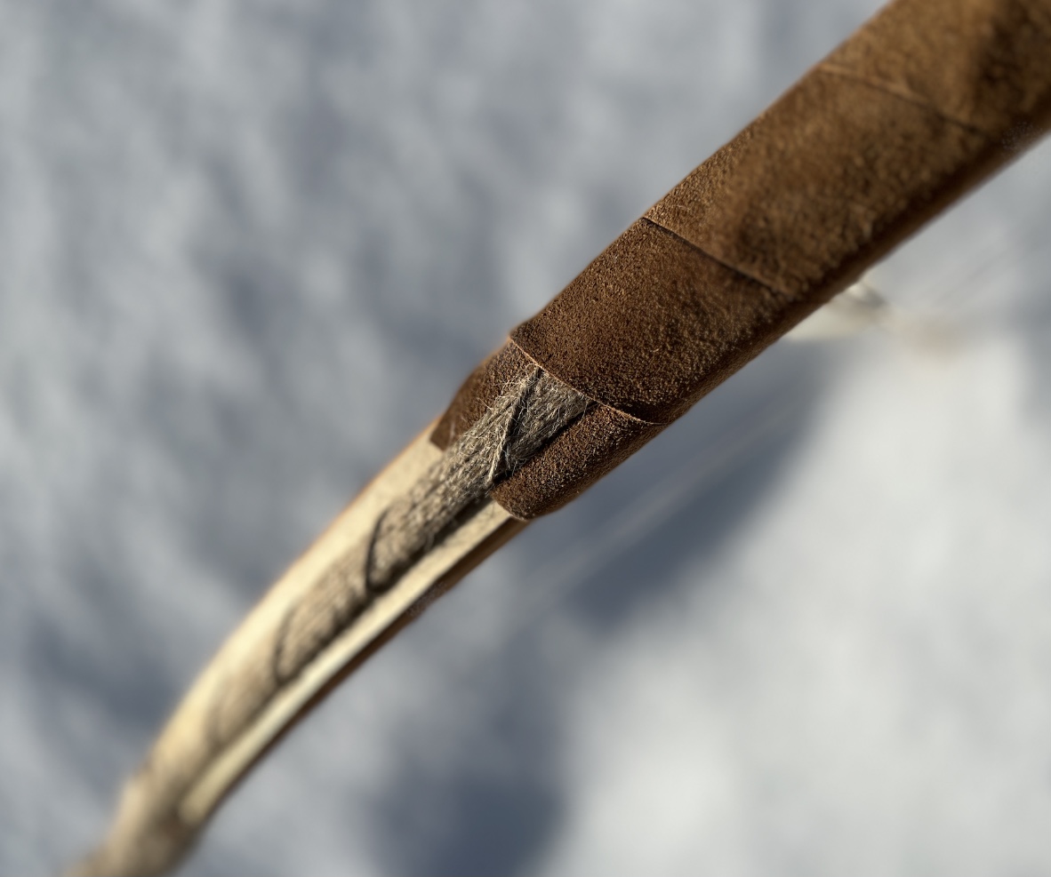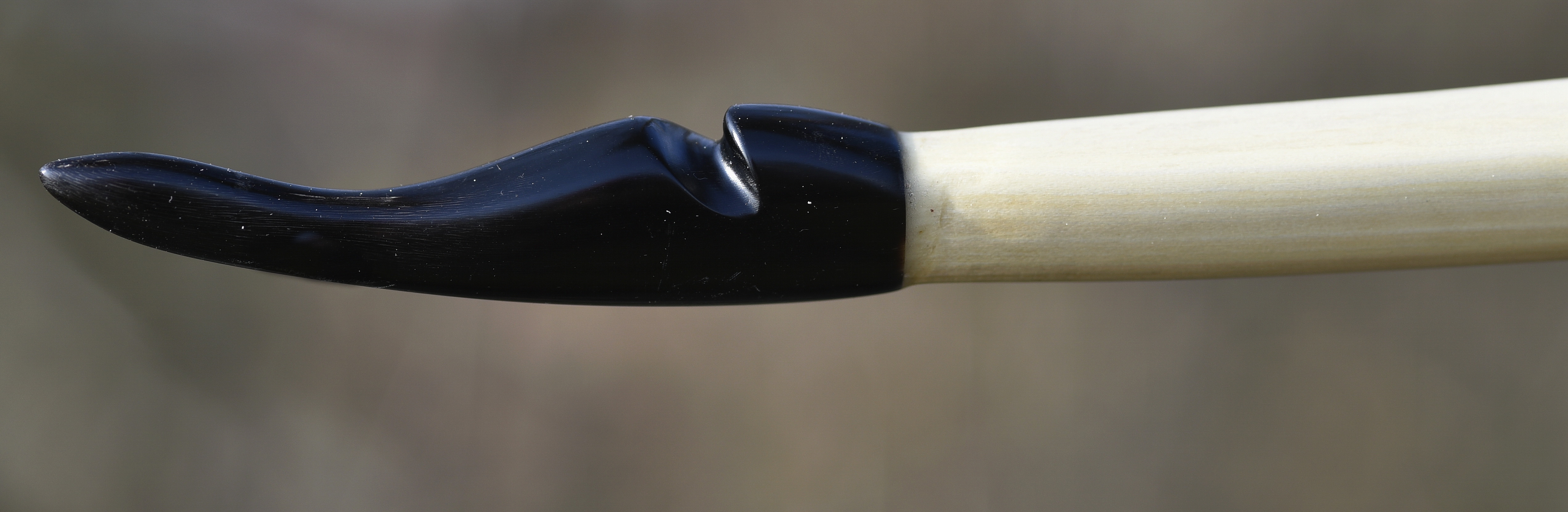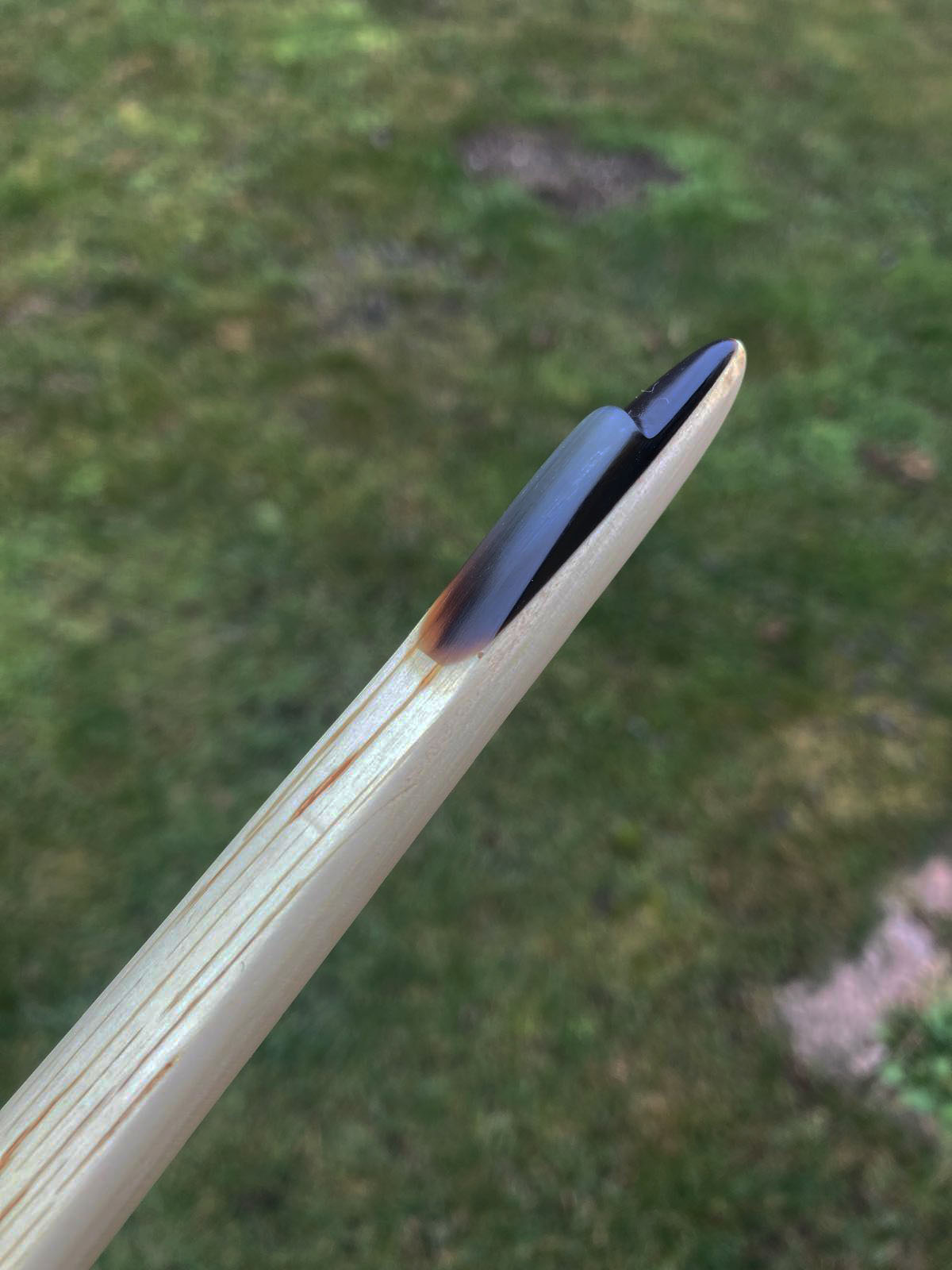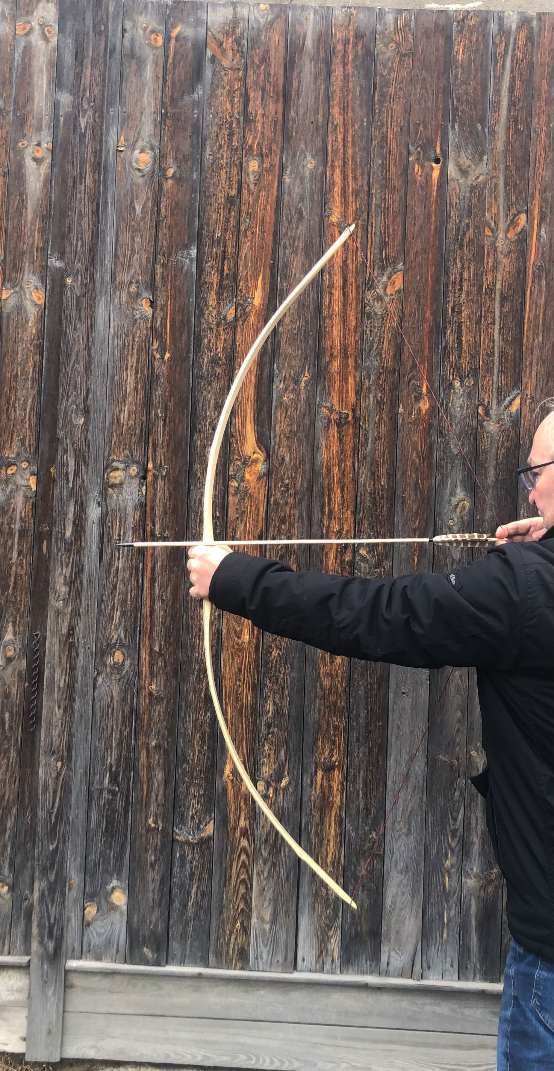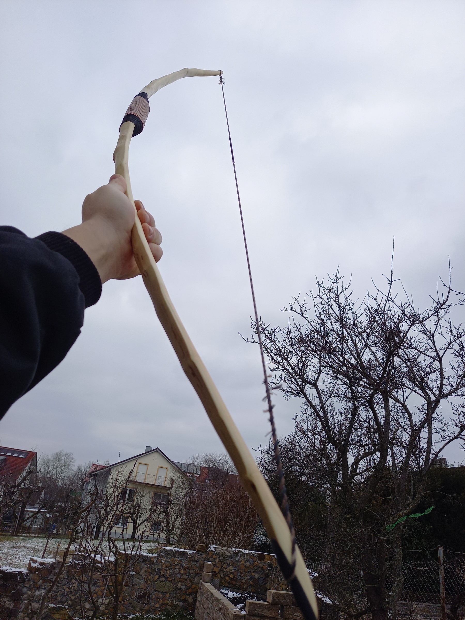Der Bogen schießt sich überraschend gut, wenig Handschock, trotz der Griffbreite bei 26 Zoll Auszug und Haselschößlingspfeil mit 45 Pfund Spine akkurat. Bei kurzem Auszug Abweichung nach links. Pfeil hebt gut ab, kein Hautkontakt. Gutmūtig und keine Kanone