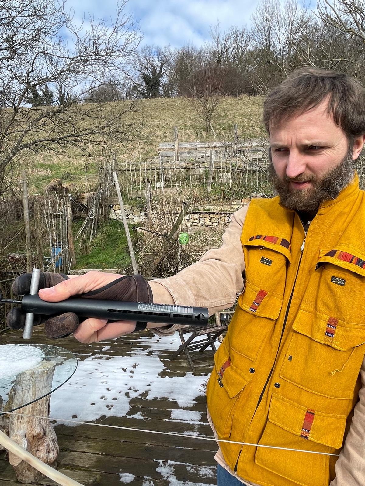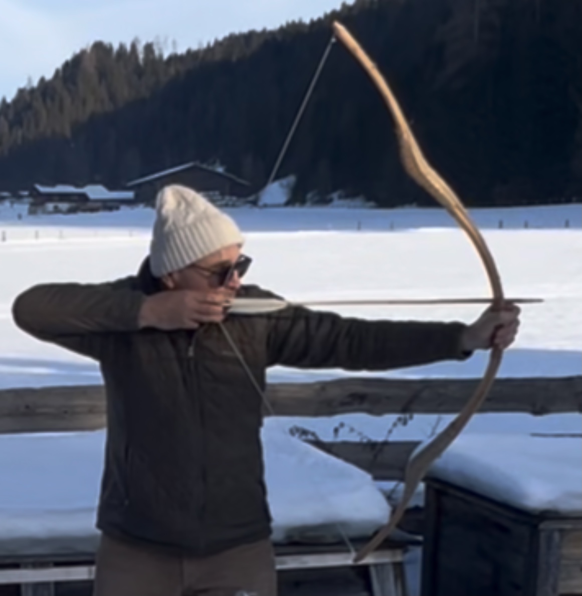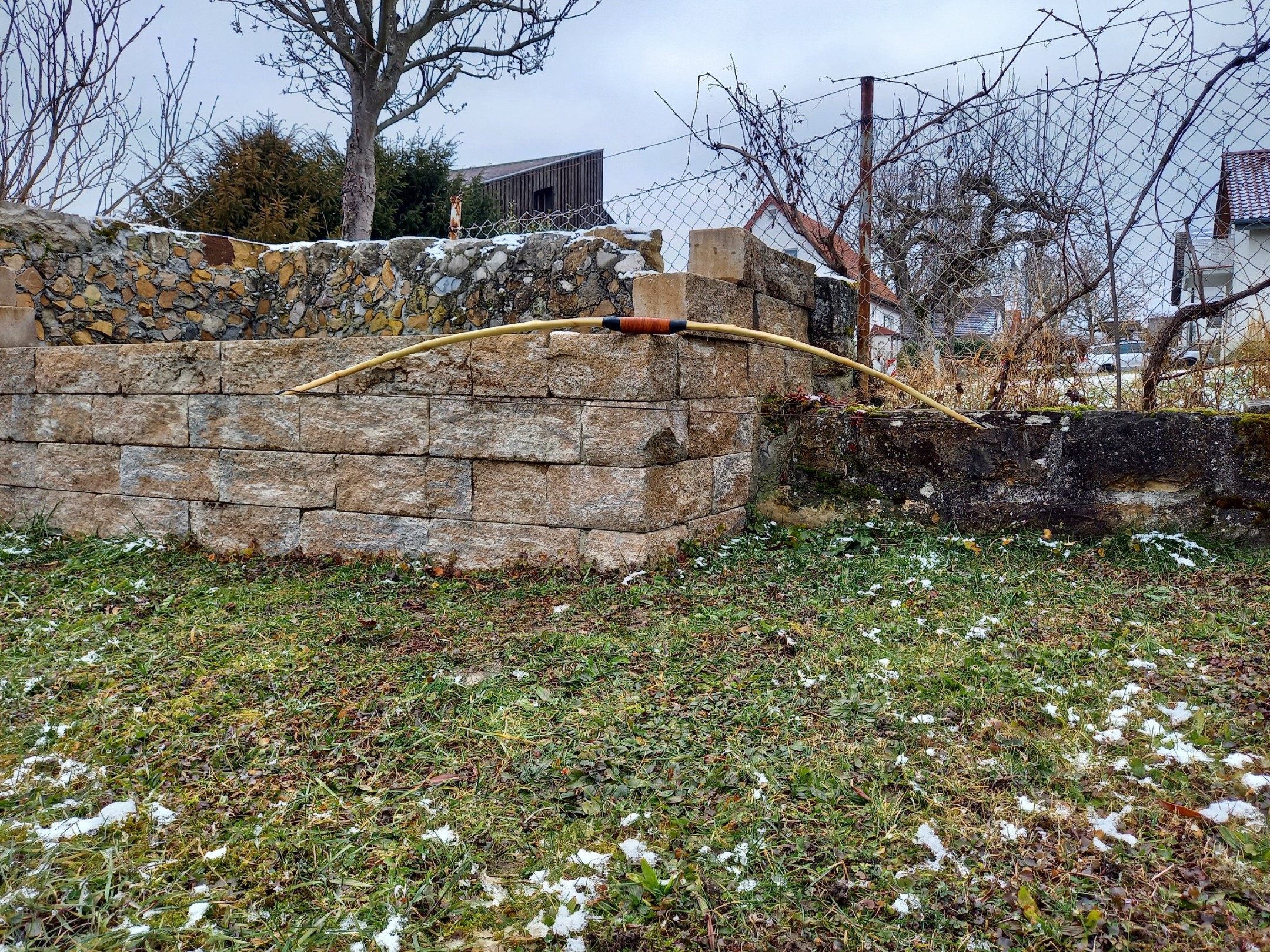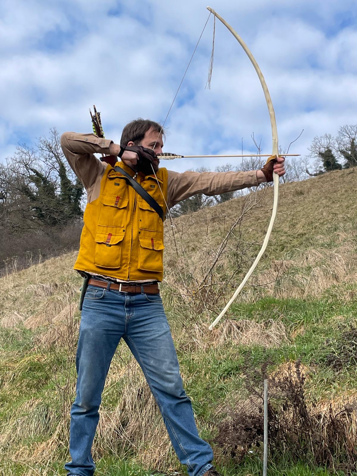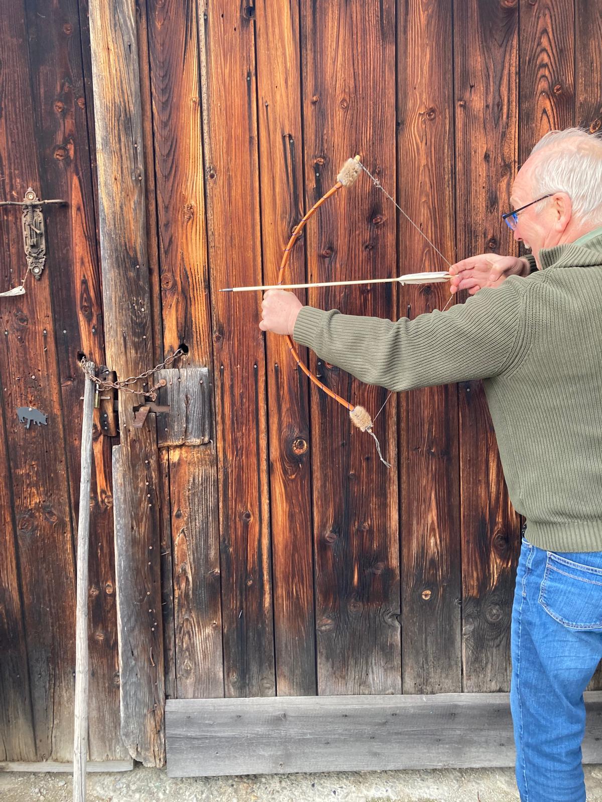 Der Bogen schießt sich überraschend gut, wenig Handschock, trotz der Griffbreite bei 26 Zoll Auszug und Haselschößlingspfeil mit 45 Pfund Spine akkurat. Bei kurzem Auszug Abweichung nach links. Pfeil hebt gut ab, kein Hautkontakt. Gutmūtig und keine Kanone