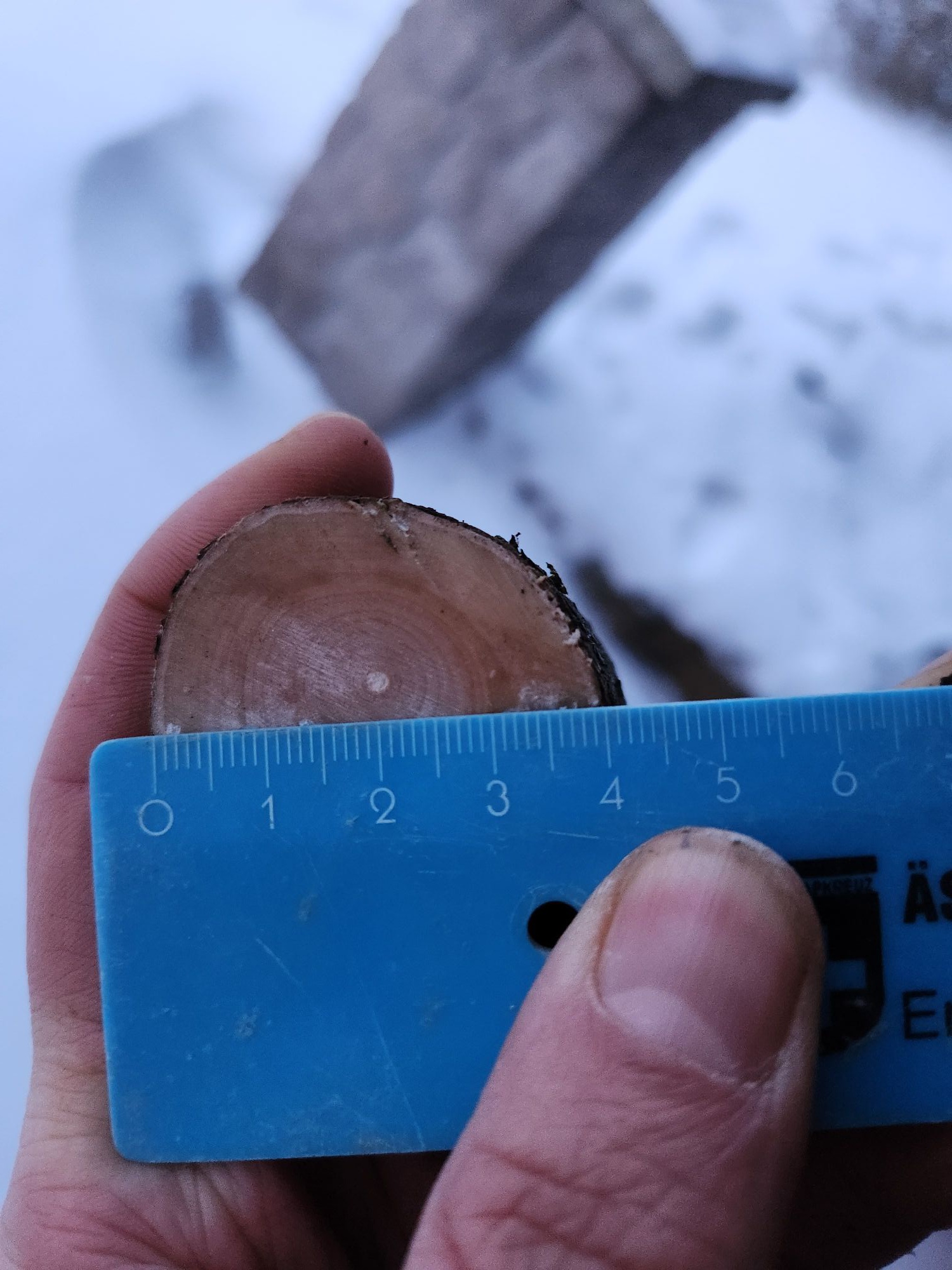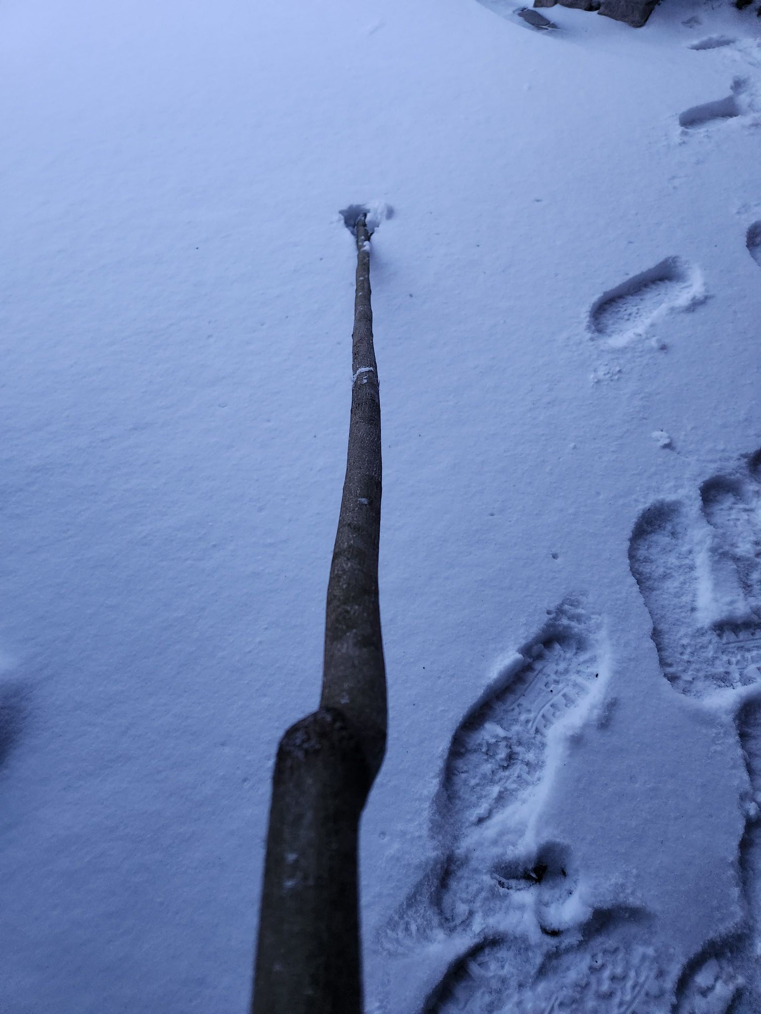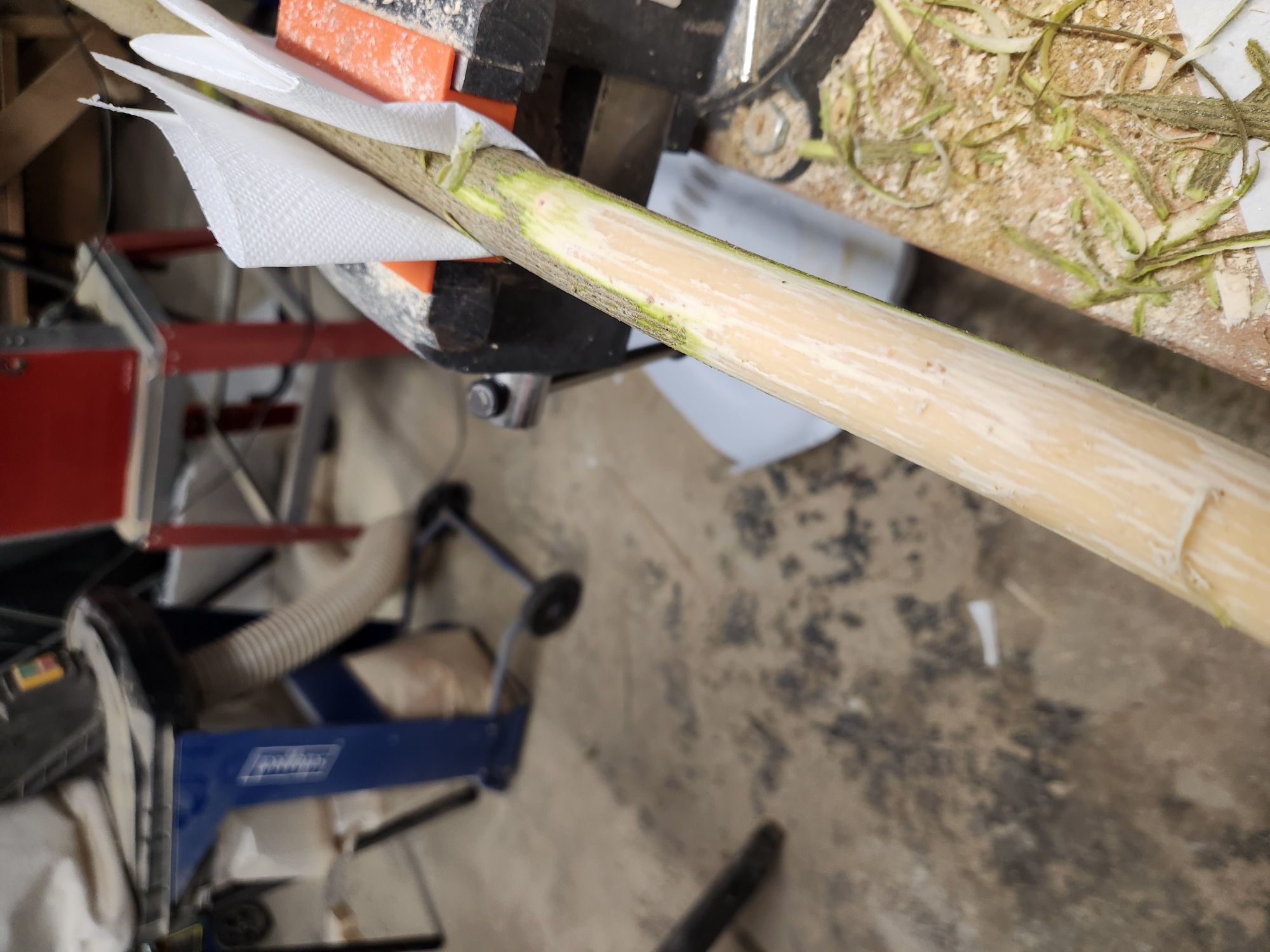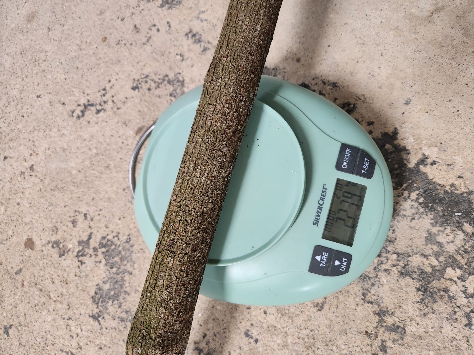 Zweiter Kandidat ist mir heute erst ins Auge gestochen. Der hat von vorne genau so ausgesehen wie der andere nur wesentlich dünner. Und der ist in der anderen Richtung viel gerader. Unterer Durchmesser: Gesamtlänge über 250cm. Hier überlege ich, ihn vielleicht erst nach dem Knick zu verwenden. Da bleibt eine nutzbare Länge von bis zu 160cm übrig. Den müsste ich vermutlich sowieso kürzer bauen damit der auch ein ordentliches Zuggewicht bekommt (mindestens 40# hätte ich schon gern). Auf den werde ich mich im wesentlichen konzentrieren weil der wenig Arbeit machen sollte. Muss ja kaum Material runter