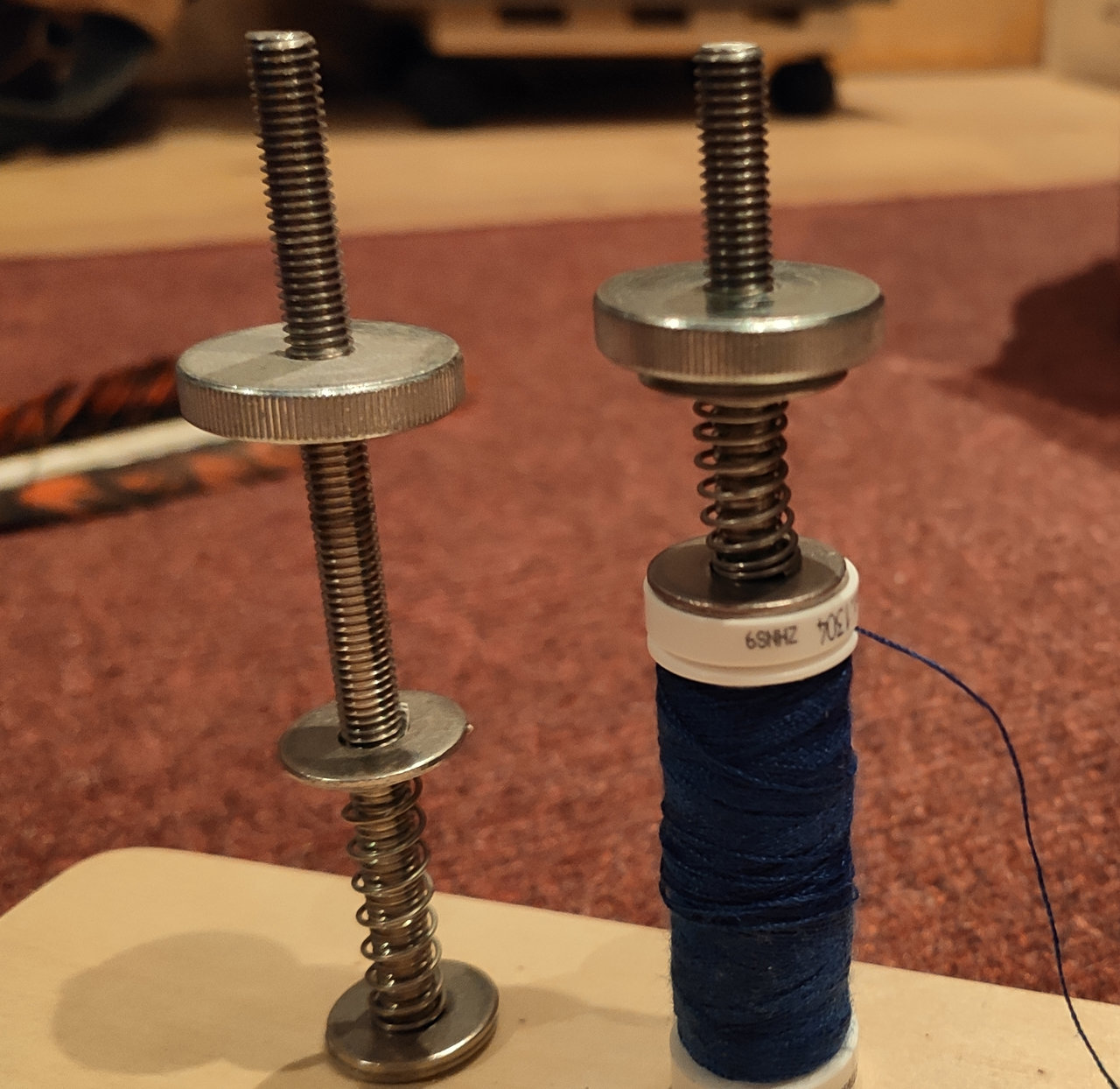 Ich habe zuerst für die Garnrollenhalter Gewindestäbe genommen und wollte die Garnrolle mit Federdruck belasten. Das geht, aber der damit zu erzeugende Widerstand (= Fadenspannung) reicht nicht bzw. die Fadenspannung ist nicht feinfühlig einzustellen und schnell zu fest oder zu locker. Wie auch bei manchen Mittenwicklungsgeräten.