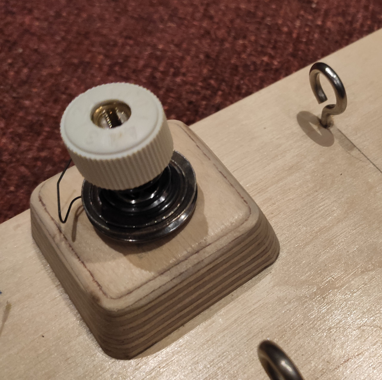 Beim Wickeln habe ich dann gemerkt, dass bei hoher Fadenspannung der Pfeil nach oben aus der Halterung herausrutscht, also habe ich einen Haltestift ergänzt.