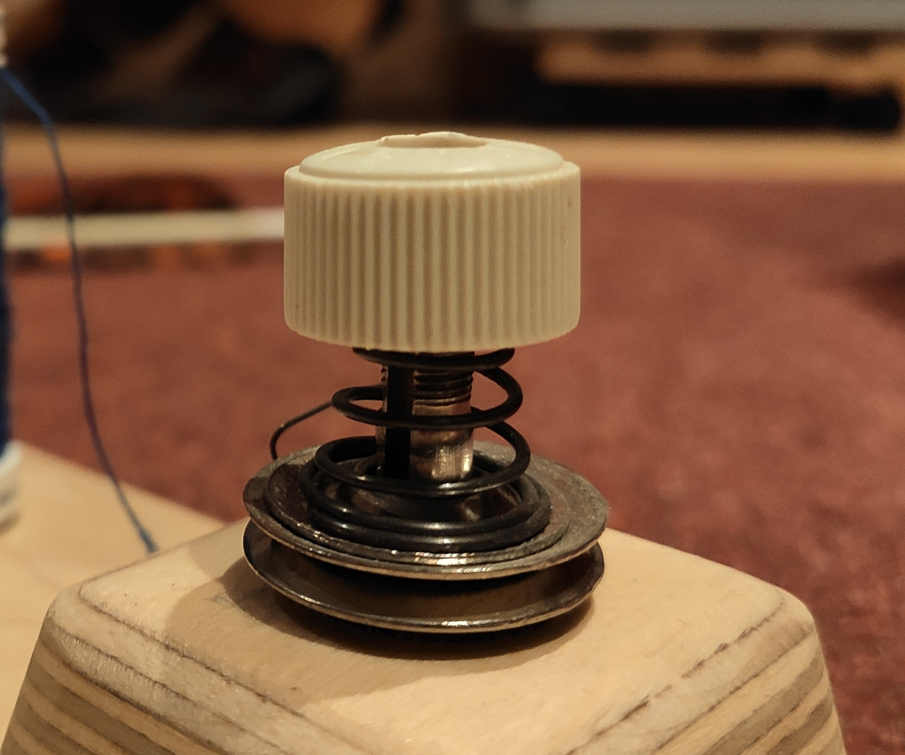 Die Einstellmutter kann man auf Null drehen, damit wird der Faden zwischen den Scheiben dann so fest geklemmt, dass er reißt.