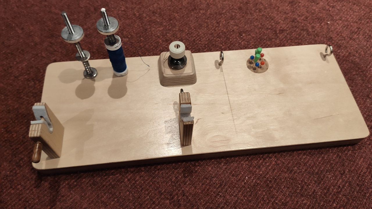 Ich habe das Gerät rechts länger gebaut und noch eine zweite Führungsöse für das Wickelgarn ergänzt. So kann ich auch Nochwicklungen machen.