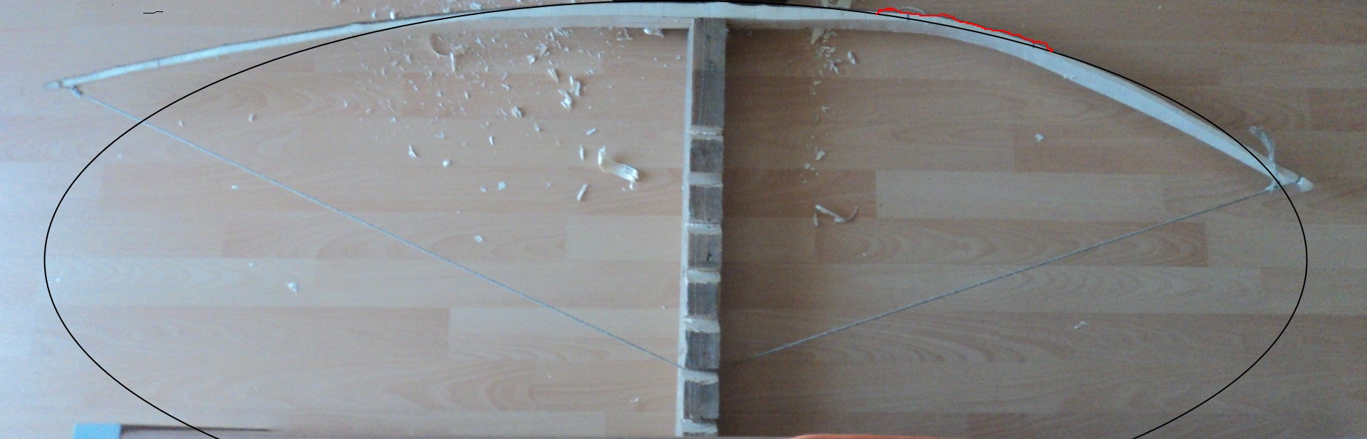 ich seh es selbst. der tiller ist mist. lag wohl daran, dass der letzte bogen auch nichts geworden ist und ich es unbedingt schaffen wollte. so sehr,dass ich ungeduldig wurde. aber der bogen ist da gebrochen, wo er sich eigentlich noch mehr biegen sollte. die stelle ist hier rot makiert: