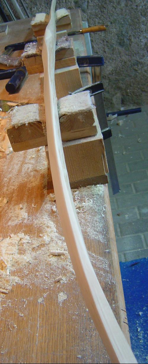 Anschließend kam noch was gaaanz wichtiges( für mich zumindest): ich hab den Bogenbauch mit Schleifpapier soweit geglättet daß man keine Bearbeitungsspuren mehr gesehen hat. Da reicht sogar schon 60er Papier. Hauptsache man kann beim späteren jeden noch so kleinen Stauchbruch sofort als solchen erkennen. Bei der Gelegenheit darf man auch gleich noch alle Kanten brechen um irgendwelchen fiesen Spannungsrissen erst gar kein Ansatzpunkt zu geben.