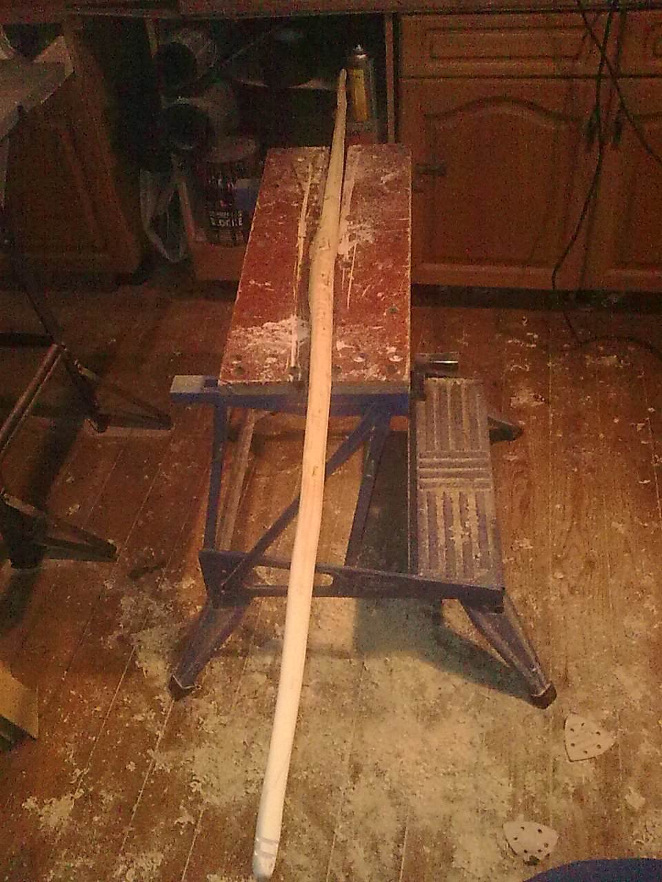 Nach dem runterarbeiten der WA bis auf/unter den Markkanal hat der Stave erstmal eine Nacht unterm Bett verbracht, bis ich dachte den könnte ich doch wegen des Knicks auf ne Latte aufspannen. Gesagt, getan (leider hab ich diesen Schritt nicht fotografiert) so hat der jetzt gut 3,5 Wochen gelegen.