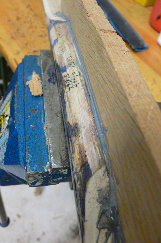 So, habe mich mal um einen Griffbereich gekümmert.Keilholz aus Eiche angepasst. Vor dem Einkleben noch eine Linie mit Superkleber gezogen, damit der noch ein bisschen in den Spalt läuft. Dann mit 2K den Keil eingeklebt. Muss jetzt bis morgen trocknen.