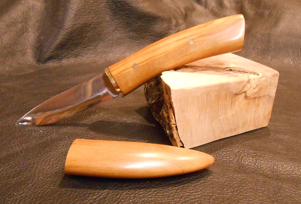 Gefällt mit gut und auch fast perfekt umgesetzt. Schönes Holz, ich mag Olive. Das kannst Du doch sicher auch ohne diesen sehr sichtbaren Spalt zwischen Griff und Scheide? Dann wär's nämlich perfekt.