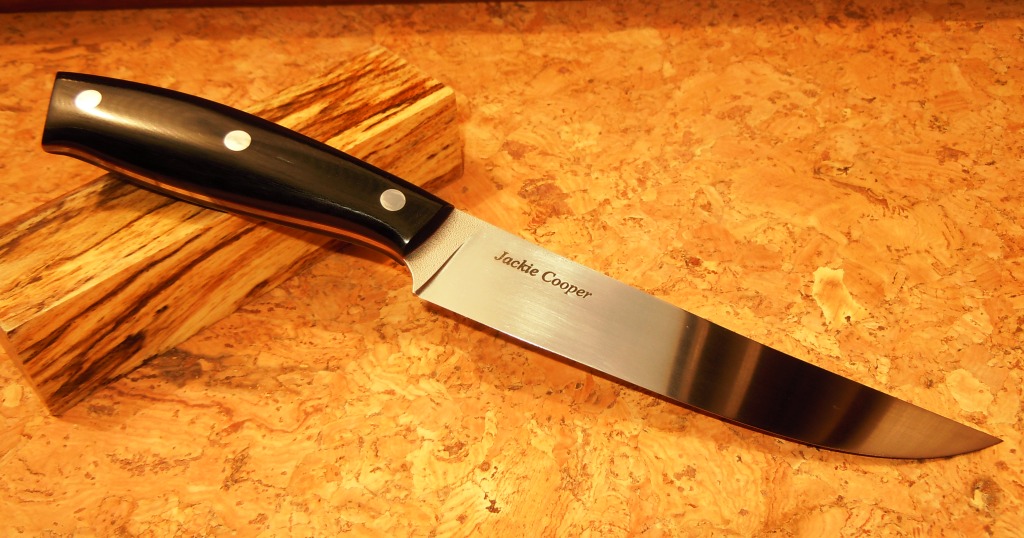 ausgeschmiedet, in Öl gehärtet und anschließend bei ca. 220°C 1 Std. Gold angelassen, Griff aus Wachholder, hellrot