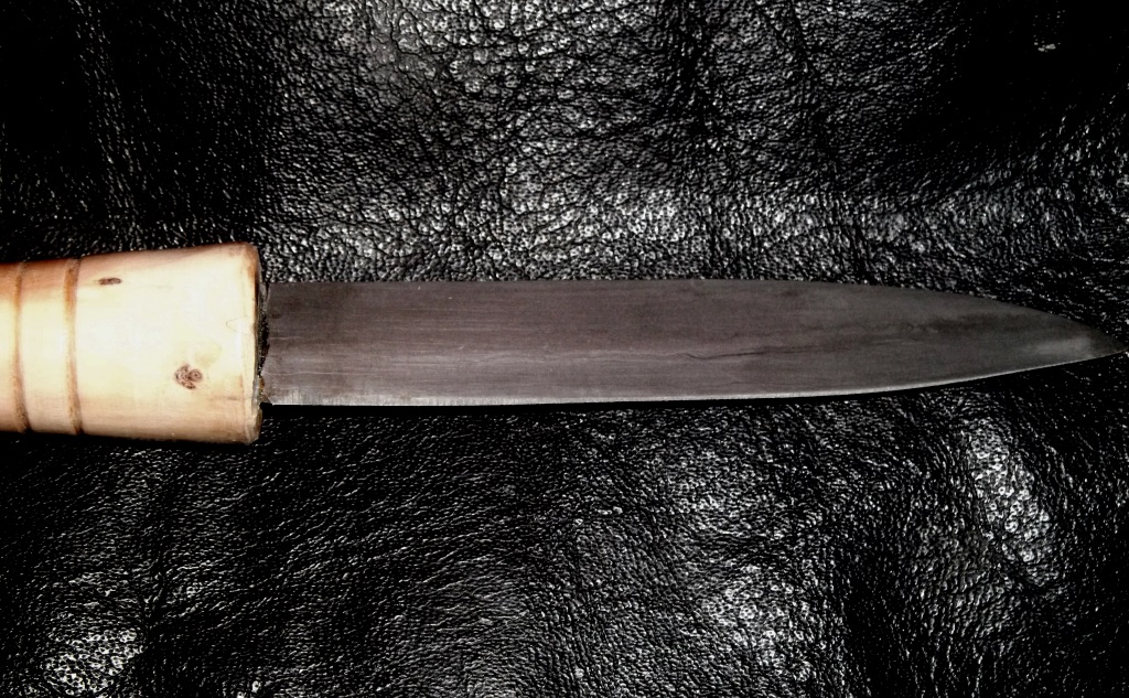 Feuerverschweißung per Hand, geschliffen, in Öl gehärtet (10 W 40), angelassen im Backofen (1h bei 180°C),
