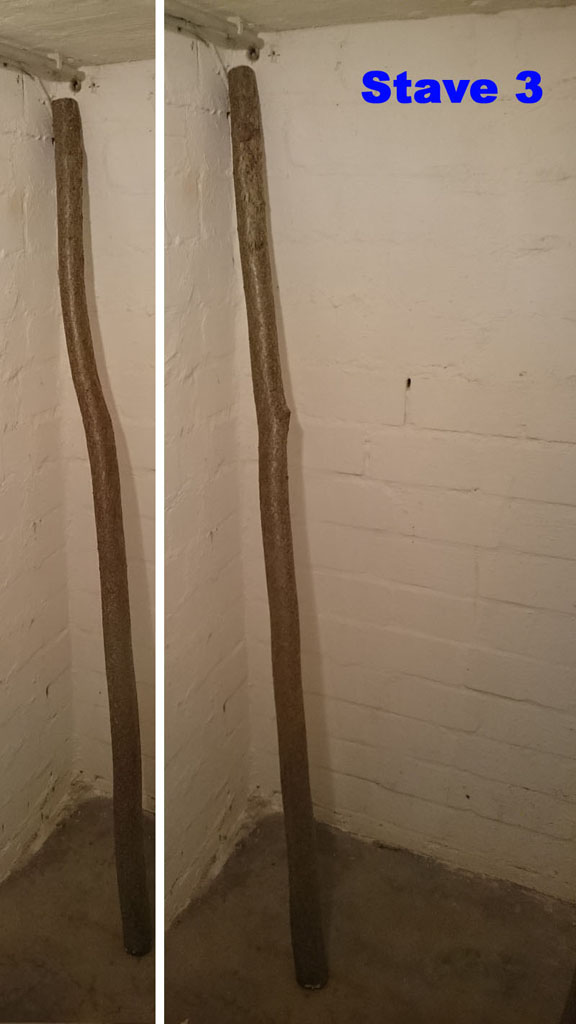 1. Stave 1 hatte im oberen Drittel einen Ast, der mit der Säge bereits entfernt wurde. Die Stelle (Siehe Bild) würde prinzipiell auf der Bauchseite liegen, bei der Bearbeitung also abgetragen werden. Kann man das machen, oder ist der Stave damit ungeeignet?