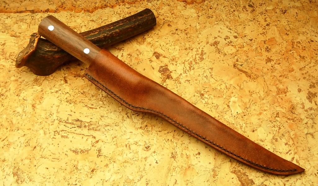 Das Messer ist für einen Freund von mir und wir haben lange über die Dimensionen gesprochen. Er wollte auch eine Scheide dafür haben. Die Scheide ist OK geworden, ich bin mir aber nicht sicher ob sie mir wirklich gefällt. Ich hatte allerdings auch keine andere Idee dazu.
