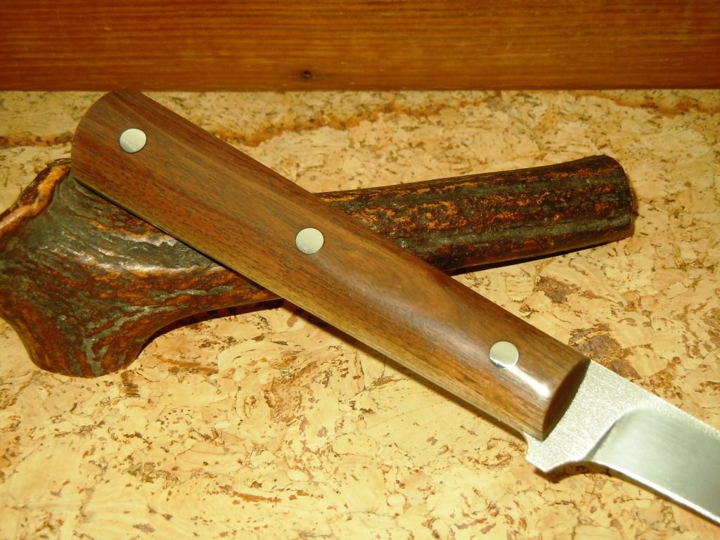 Der Griff ist optisch sehr schön, nur für die Arbeit scheint er mir zu glatt, da würde ich eine Riffelung oder ein Muster bevorzugen, ich bin beim Filetieren von Fisch oder beim Zerlegen von Schwein häufiger abgerutscht weil der Griff von Fett und Blut überzogen war.