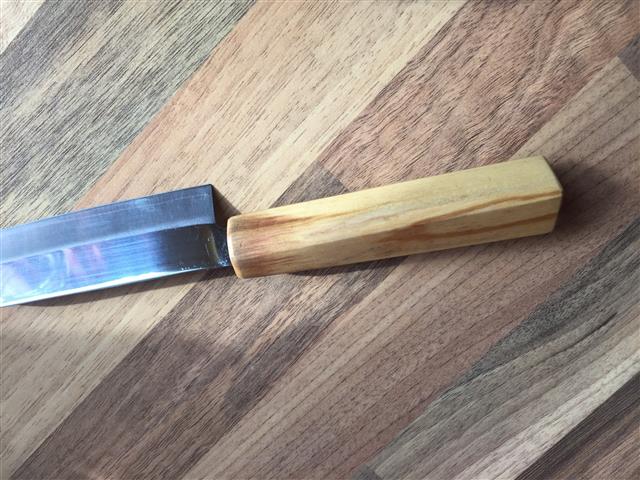 Japanisch angehaucht mit westlichen Griff. Die Schneide hab ich nur halb hoch angesetzt und die Walzhaut diesmal entfernt.