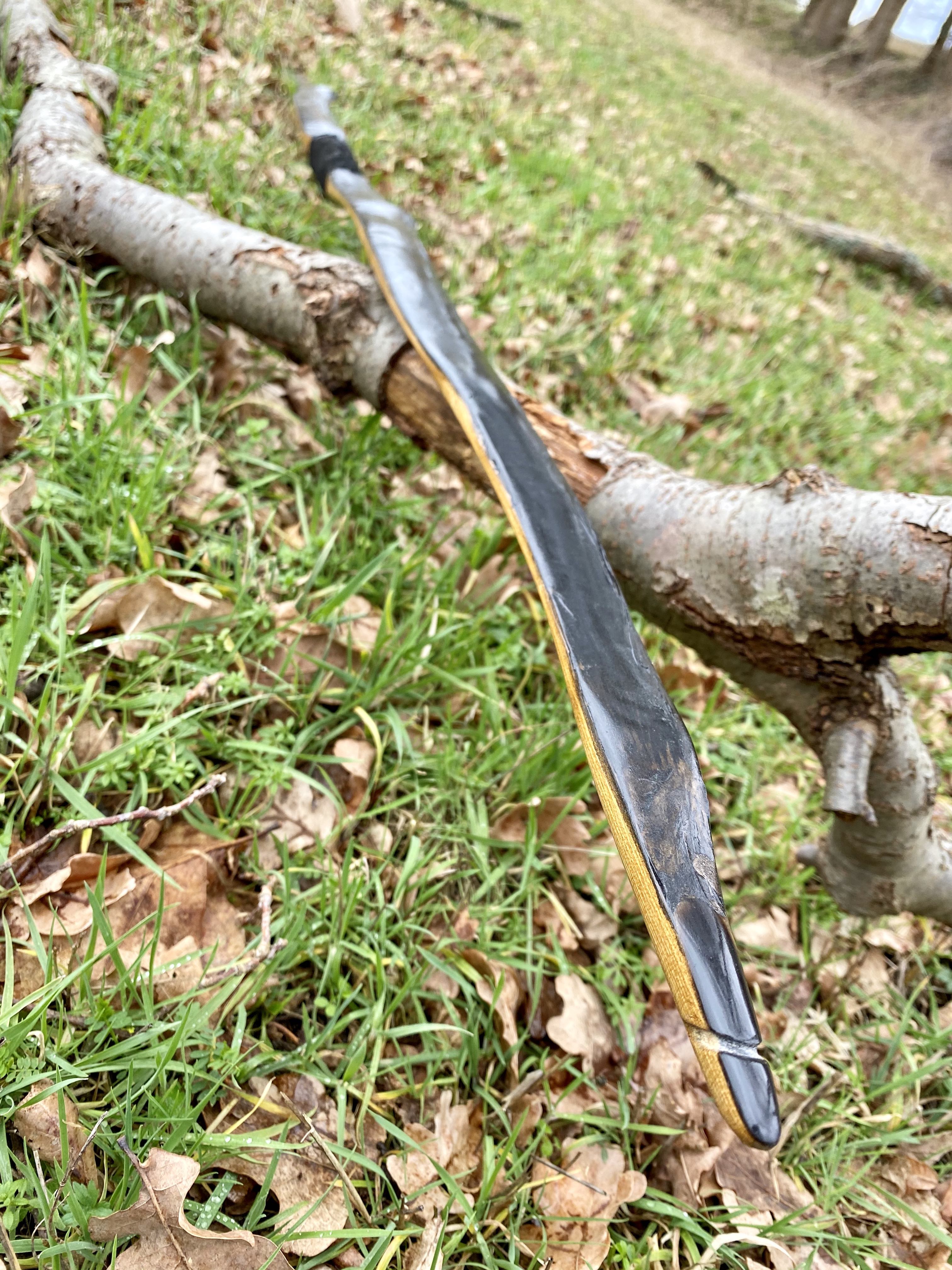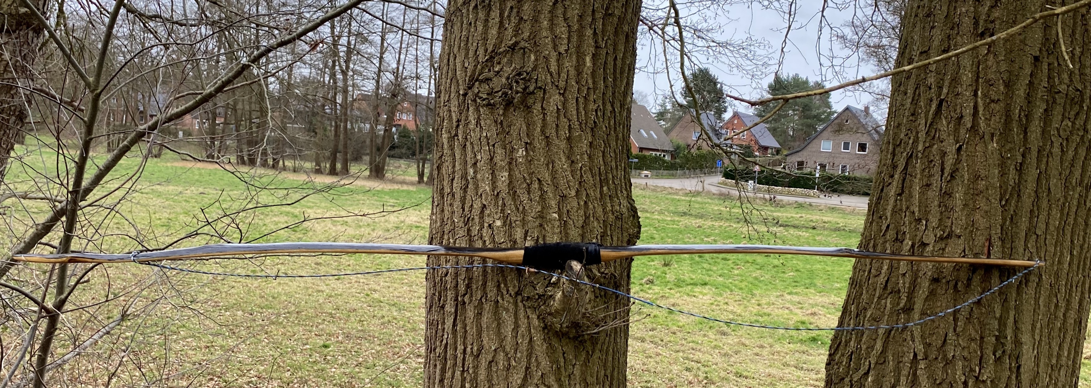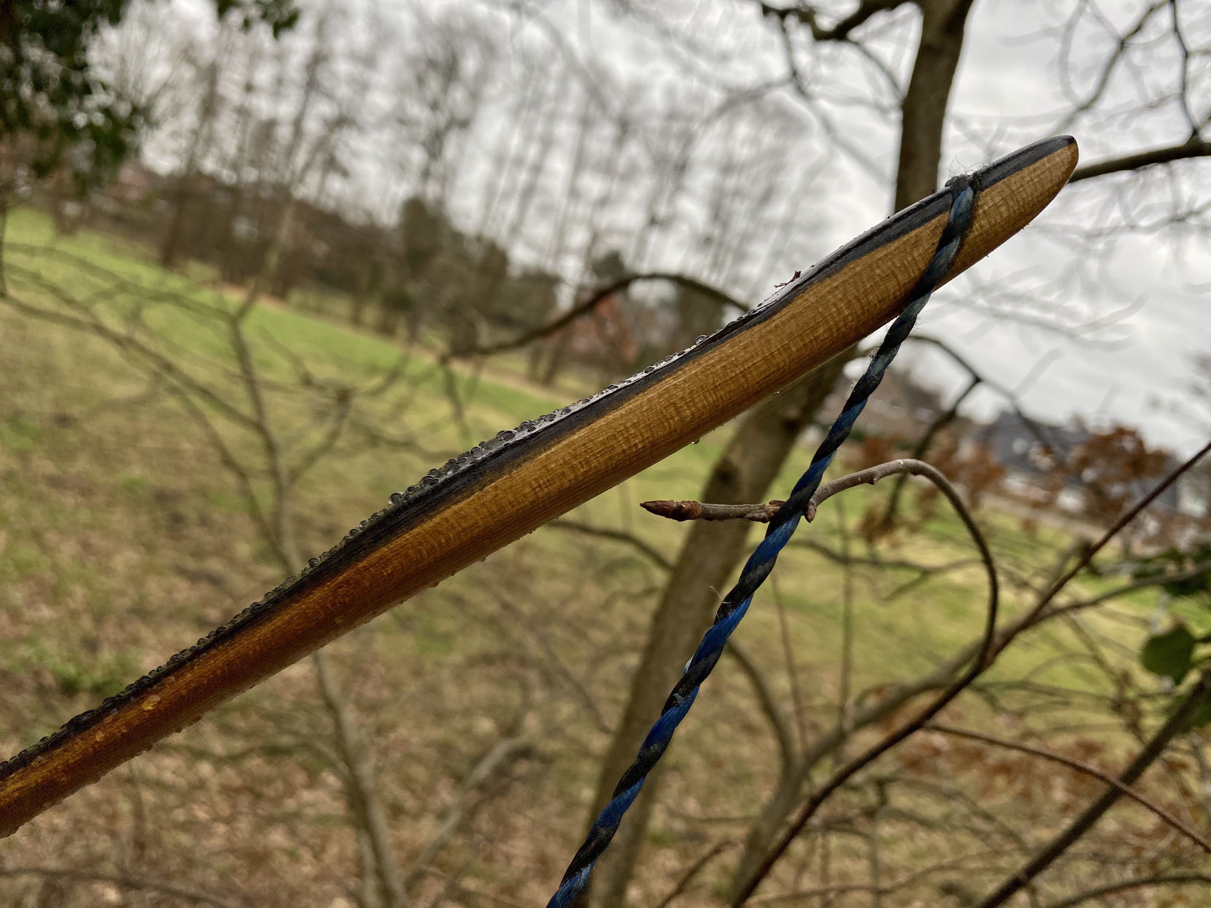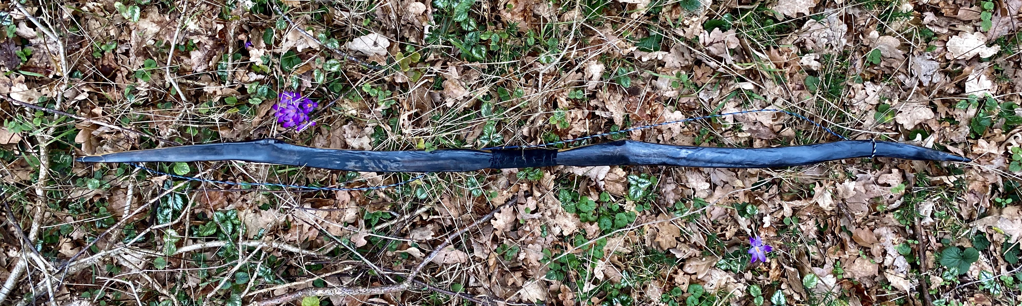 Das Kuhhautbacking habe ich mit Hasenleim angebracht. Gesammelt habe ich dabei vor allem Erfahrungen: Beim ersten Versuch hat sich die Haut soweit auf dem Rücken des Bogens verschoben, dass ich sie noch einmal abnehmen musste. Beim wiederholten rauflegen, war sie dann nicht mehr feucht genug, hat aber gepasst. Ich habe sie dann so gelassen mit der Folge, dass einige Bereiche der Haut nicht auf dem Bogenrücken kleben geblieben sind. Korrigiert habe ich die entsprechenden Stellen mit Epoxidharz. Anschließend wurde die Kuhaut fein geschliffen, die schwarze Beize aufgetragen und die Farbe soweit wieder abgezogen, dass die Struktur derselben wieder durchschien. Finalisiert wurde der gesamte Bogen mir mehreren Lagen Danish Oil.