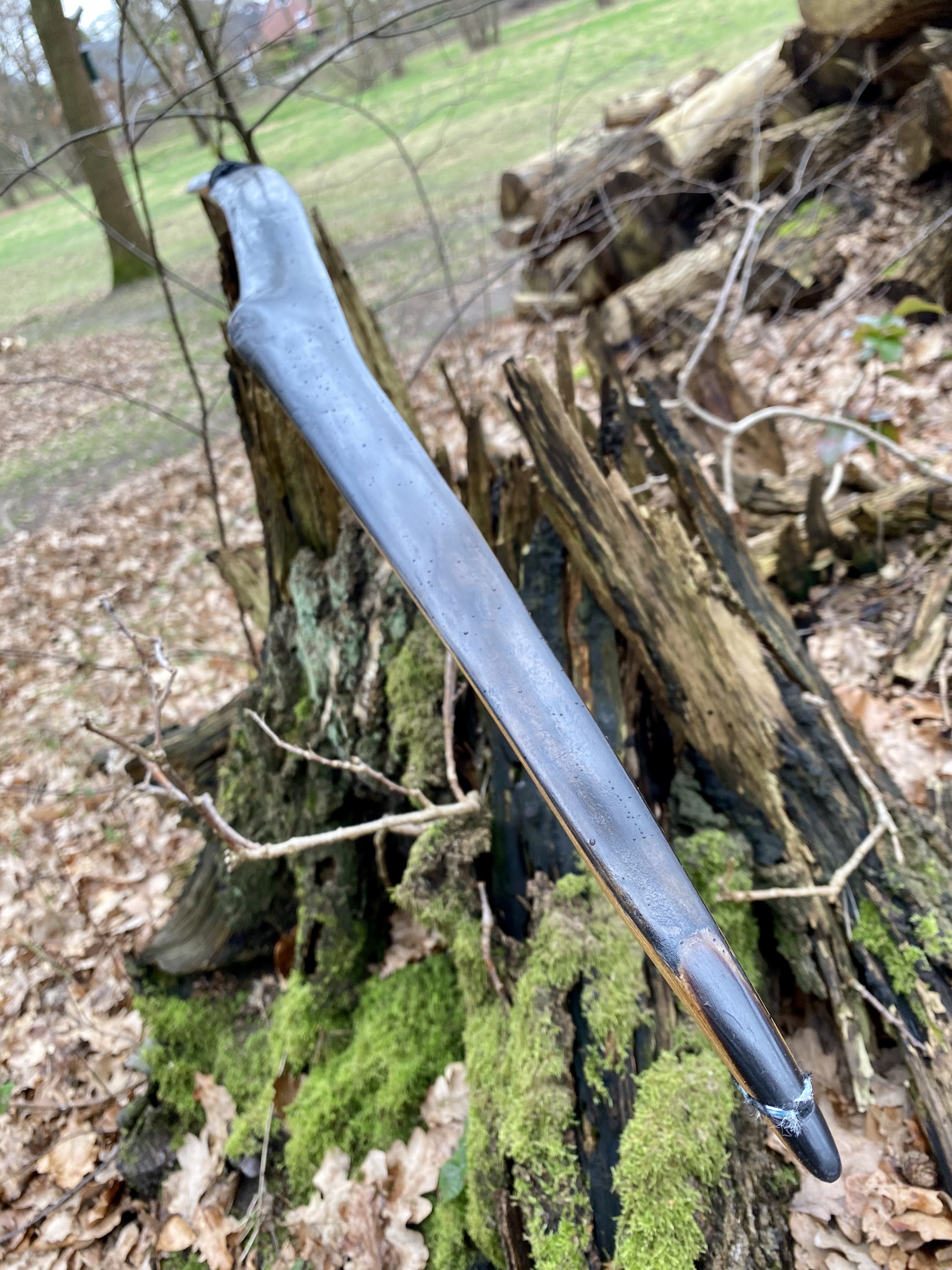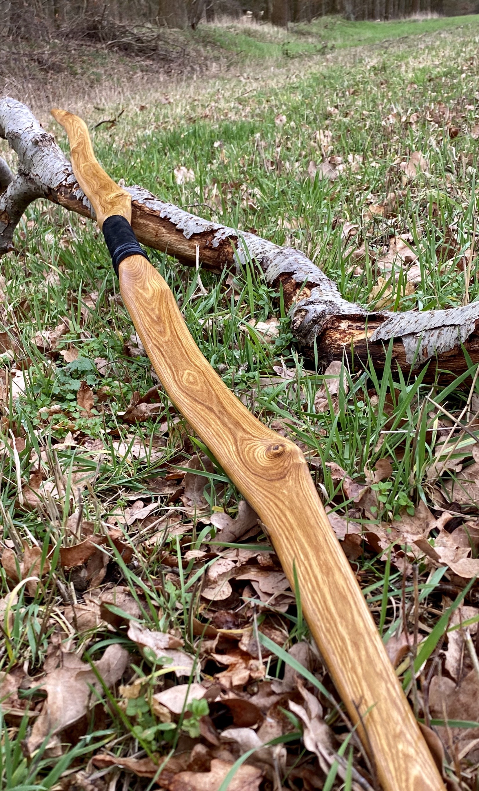nach langer Zeit - schlußendlich durch den aktuellen Saplingbow und die tollen Bauthreads getriggert - habe ich mich mal wieder an einen Goldregenstave gemacht. Da der Bogen aus dem gleichen Ast wie dieser stammt und da ich immer schon ein Rohhautbacking ausprobieren wollte, habe ich aus dem selben Holz ein anderes Design ausprobiert. Herausgekommen ist ein snaky Flachbogen, der bedeutend langsamer und schwerfälliger schießt als sein Bruder, mit dem ich aber viel besser treffen kann.
