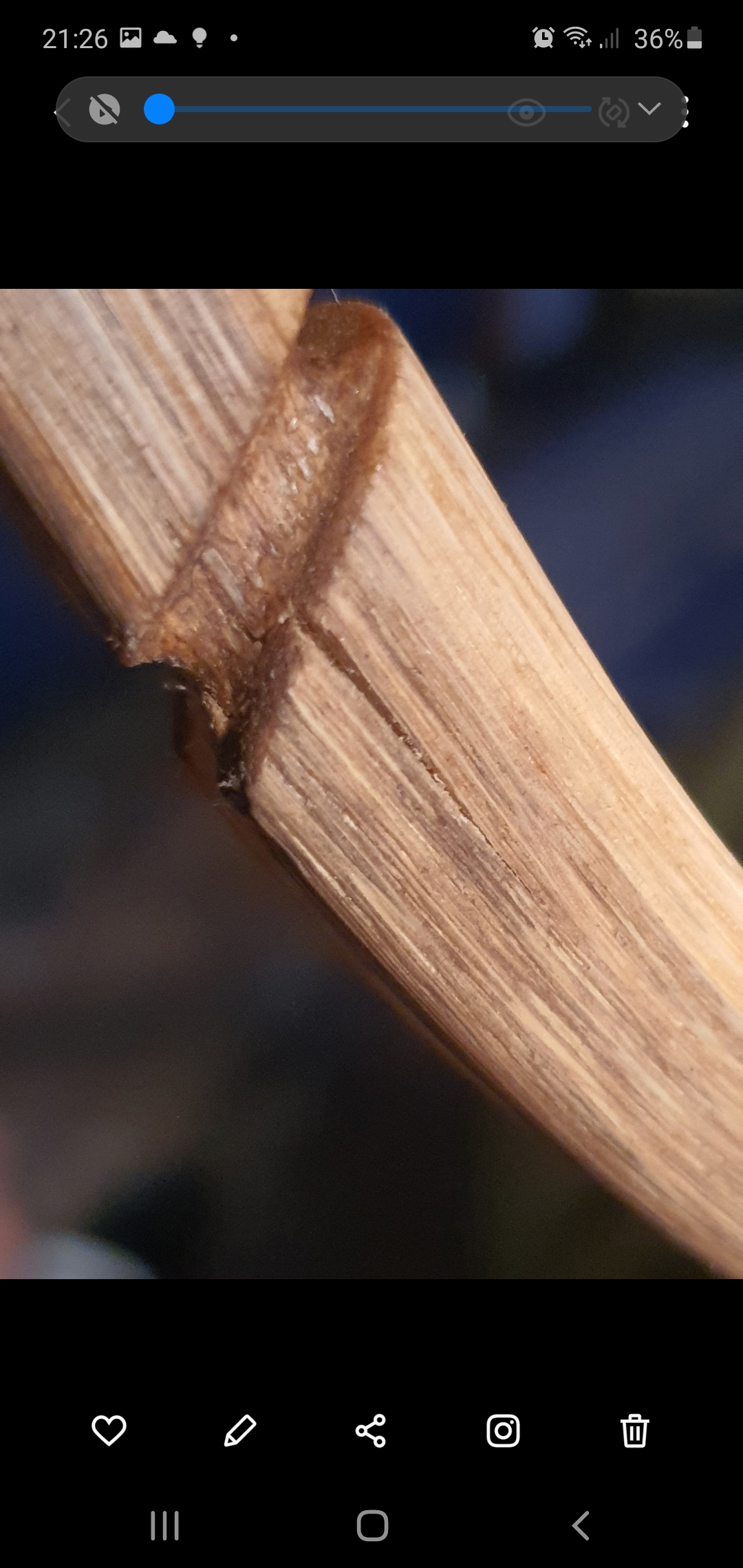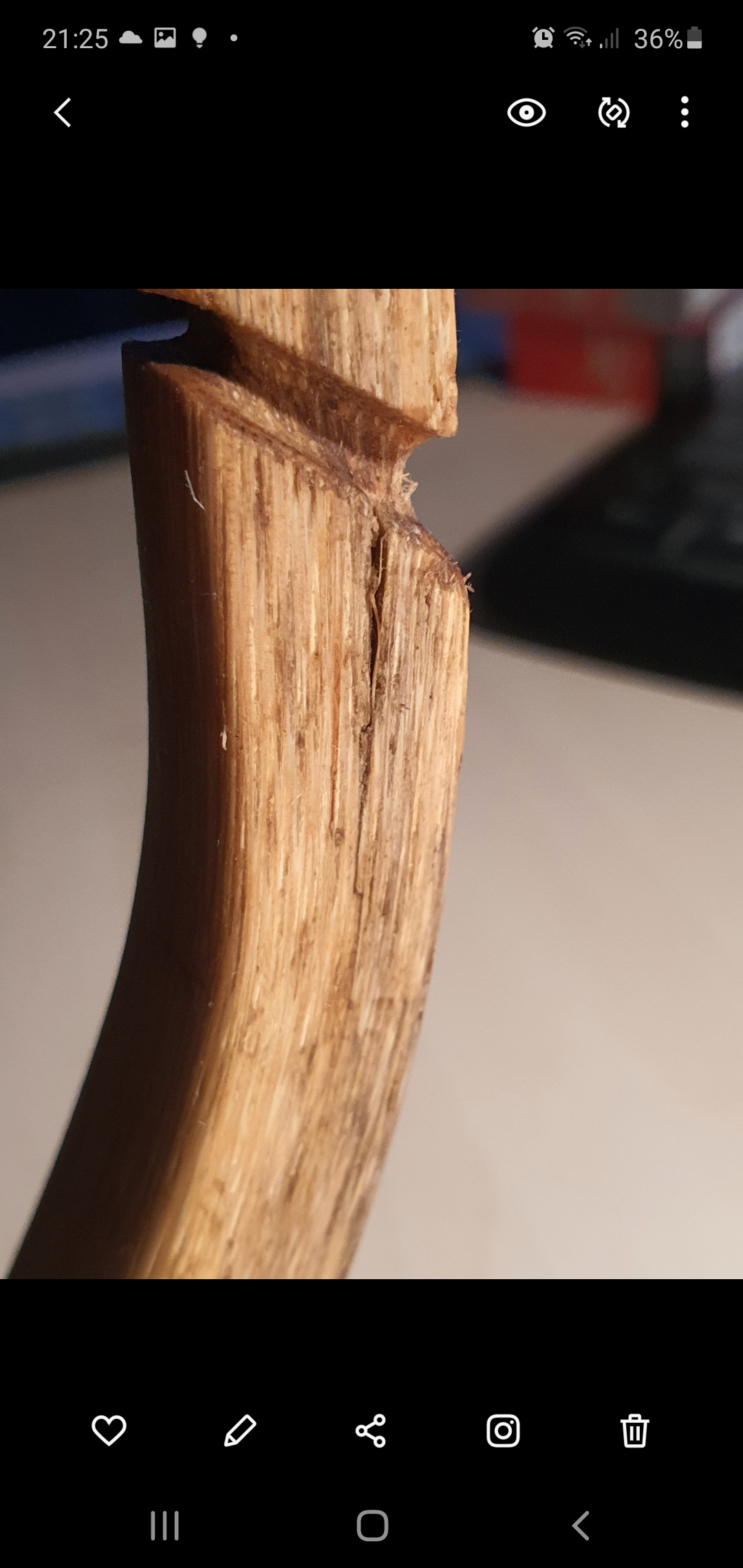 Danke das du Bilder nachgereicht hast, aber das Vollauszugsbilder immer von der Seite fotografieren, sonst kann man es schlecht beurteilen. In deinem Fall reicht es aber aus.... Was ich dir jetzt sage, wirst du nicht hören wollen. Erstmal mein erster war auch nicht besser ;) In dem Bogen sind so viele Fehler drin, da macht es keinen Sinn mehr das alles zu ändern, es sei denn du willst daran üben. Ich würde dir empfehlen einen neuen zu bauen. Du kannst dir auch einen aus Hasel bauen, der wächst überall und ist in 3 Wochen trocken. Das was verändert werden müsste , an deinem jetzigen Bogen wären folgende Dinge: