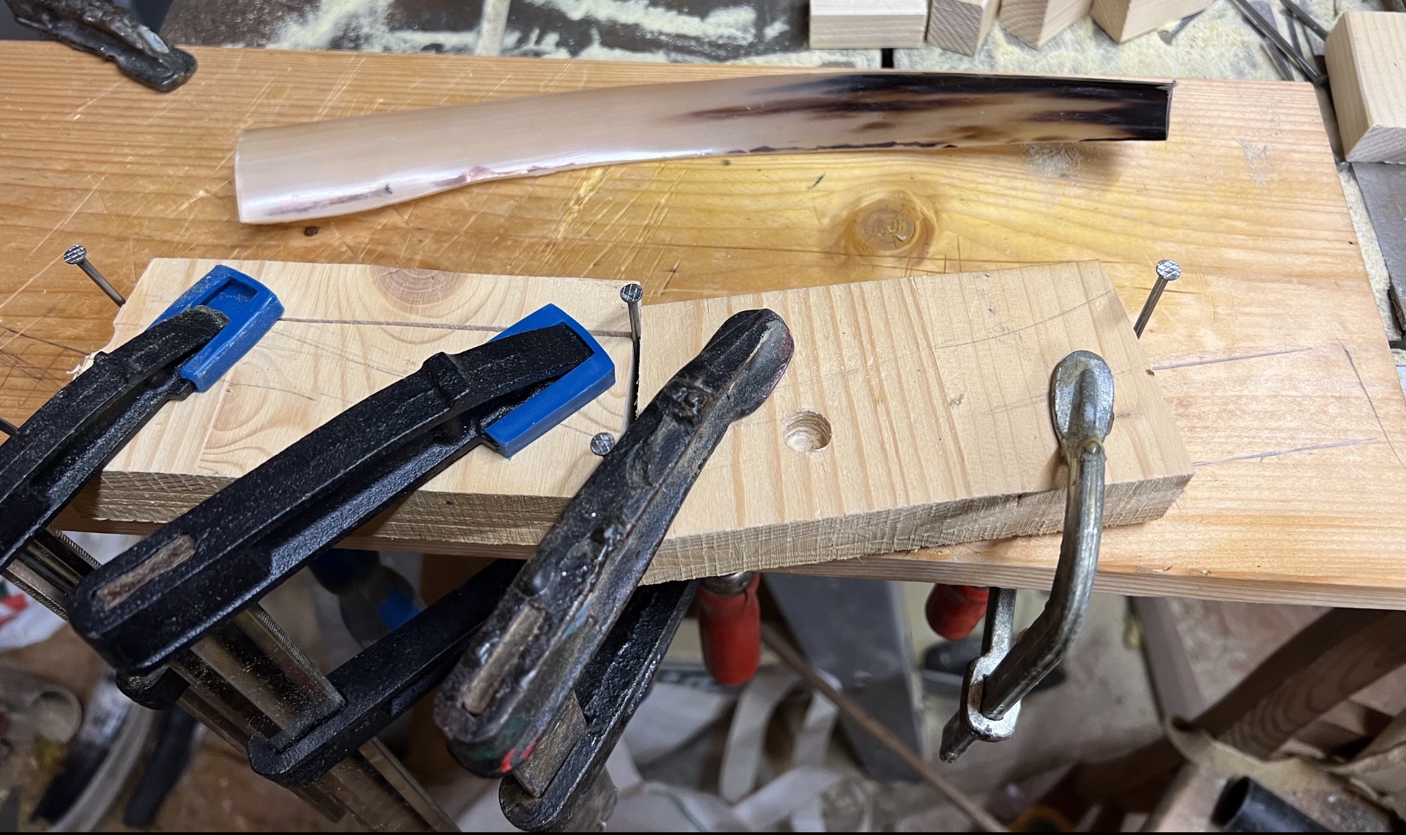 Nur die letzten 5cm der Hörner waren solide, diese Kuhhornspitzen habe ich abgeschnitten , dann die dickeren Enden etwas flach geschliffen, dann mit dem Fön erhitzt, begradigt (primitiv mit den Nägeln auf der Holzplatte in Form gezwungen) und mit Holzklötzen und Schraubzwinge flach gepresst, abkühlen lassen und die Innenseite schleifen.