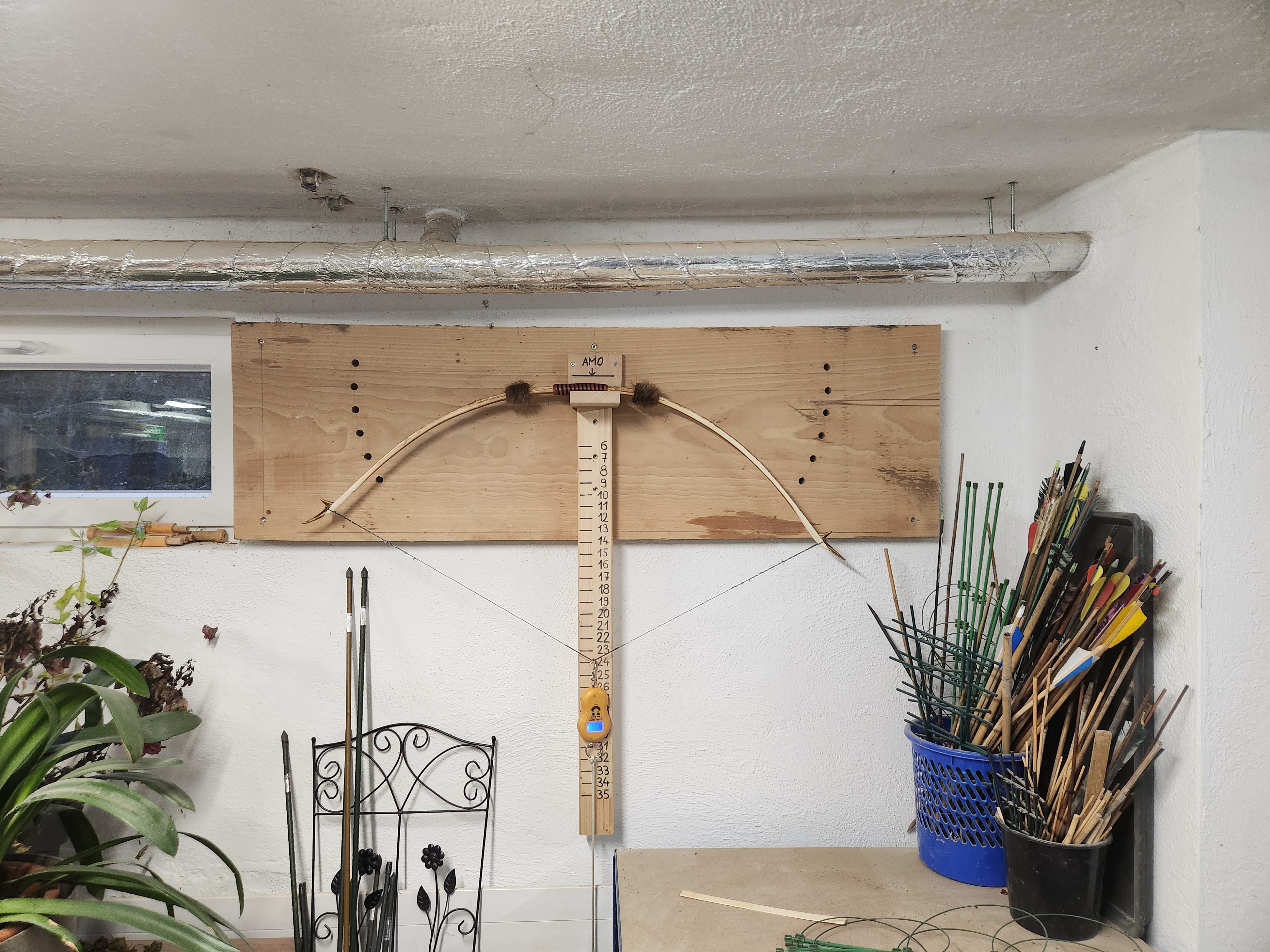 Jetzt hab ich ihn nochmal am Tillerbaum gelegt. Beim letzten Foto hatte ich ihn mit dem Druckpunkt mittig auf den Baum gelegt und die Zuggewichtswaage dort eingehengt wo der Mittelfinger greift. Was ja den Bogen so belasten sollte wie es beim schießen der Fall ist. Diesmal hab ich ihn mit Griffmitte aufgelegt und die Waage mittig vom Baum eingehengt und da siehts gleich viel weniger schlimm aus. Etwas schwach ist er an der Stelle trotzdem.