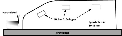 Zeit vom Herausnehmen aus Dampfkammer bis Festkeilen ca. 7sec., langsam biegen und 1. Zwinge ca. 10sec., 2. Zwinge nach ca. 10 sec. 3. Zwinge ebenso. Wichtig: sehr schnell arbeiten, fertig nach spätestens 30-45sec. Ev. Transport in der Damfpkammer zum Biegeort. Kleine kurze Stücke: in vorerhitzter Thermoskanne Transport probieren.