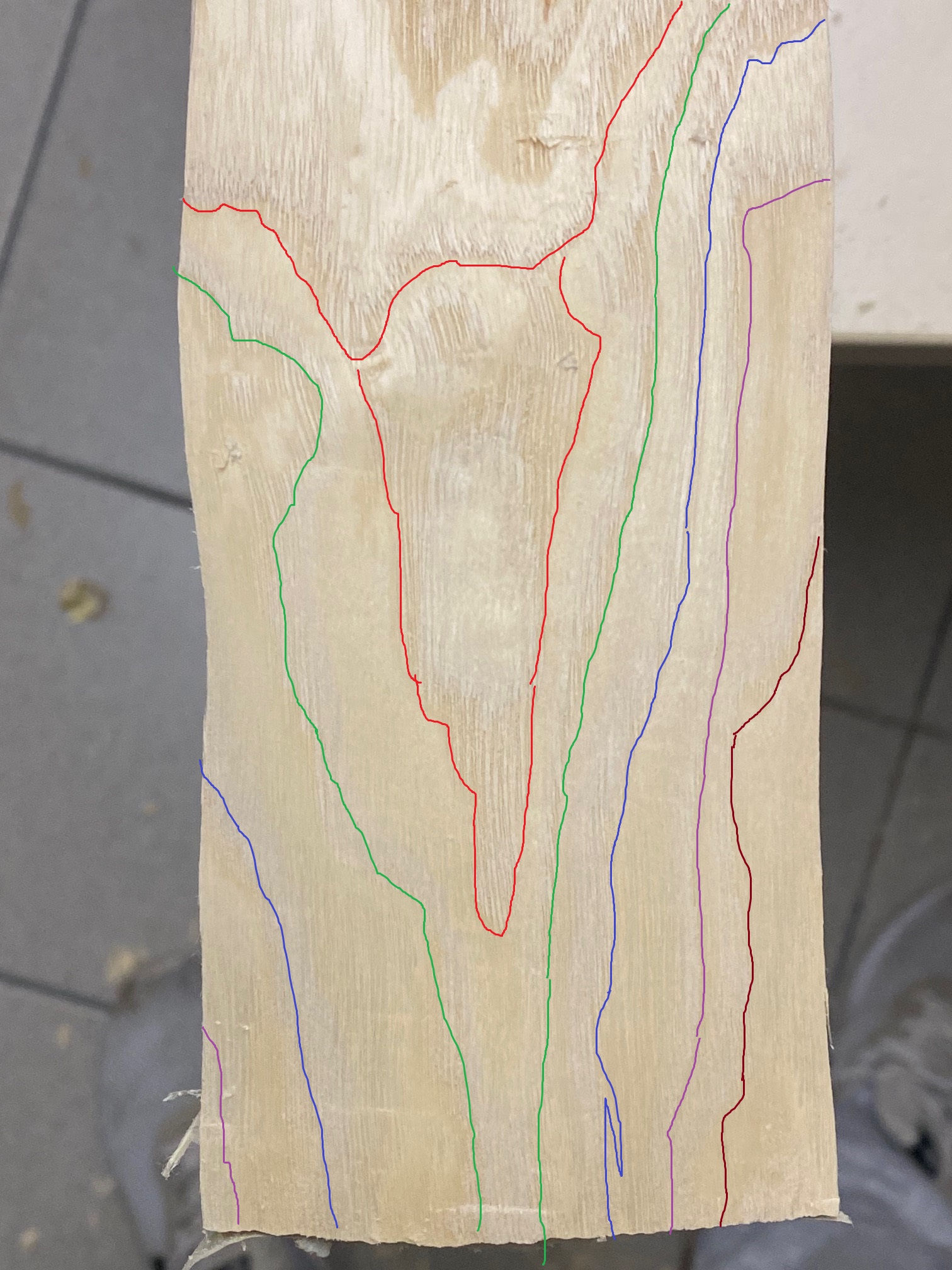 Frage: wenn ich so viele Jahresringe abtrage, und - so ca. 2cm Dicke bei den Armen und 4 cm Dicke beim Griff einrechne sind die eingewachsenen Äste definitiv im Einflussbereich auf den Bogen? Ich habe eine Seitenansicht des Stammes gemacht, und die Äste mit Klebestreifen markiert (Ast jeweils zwischen Klebestreifen) und markiert wie ich die Wellen sehe