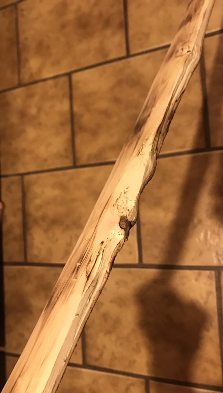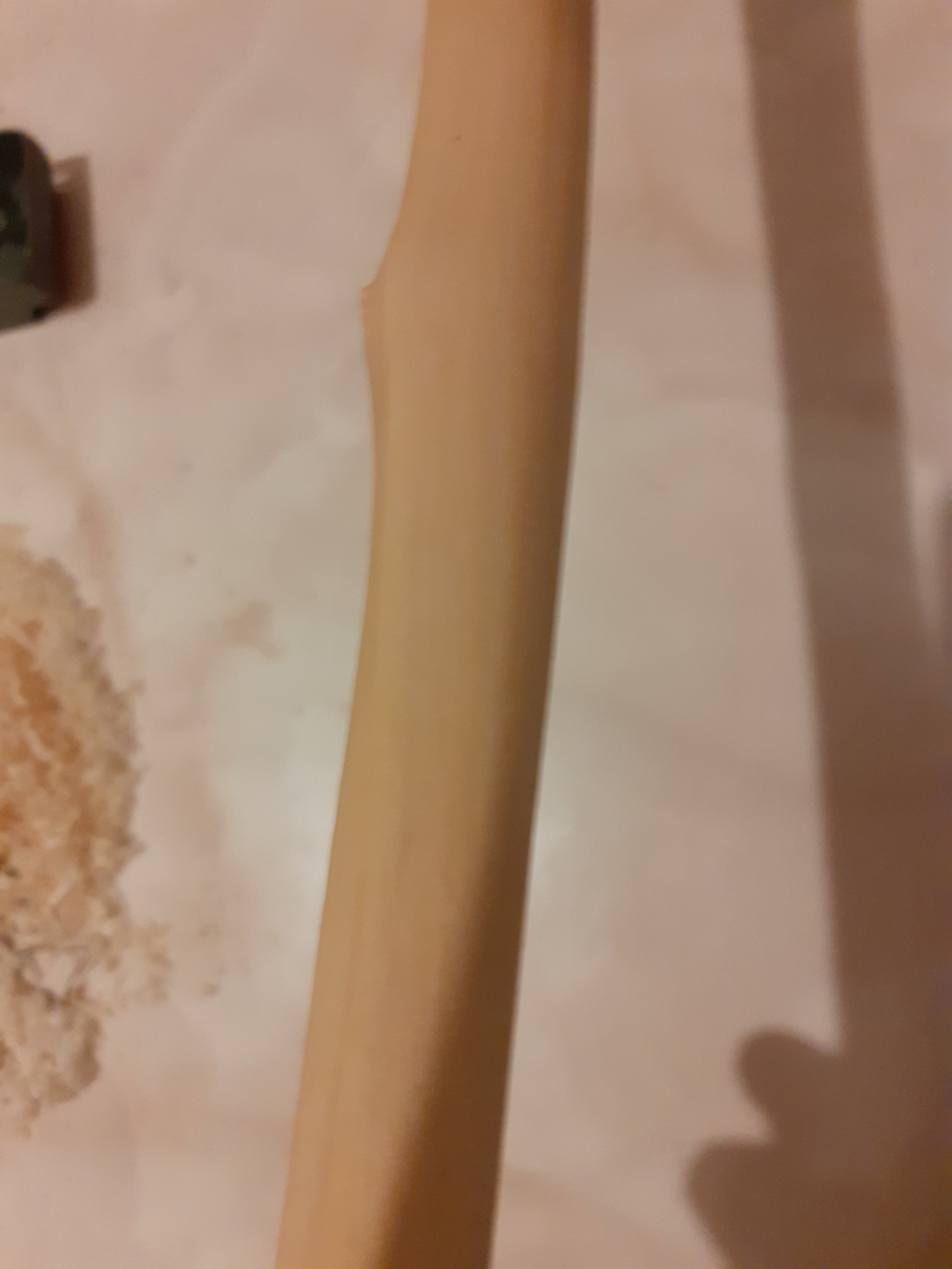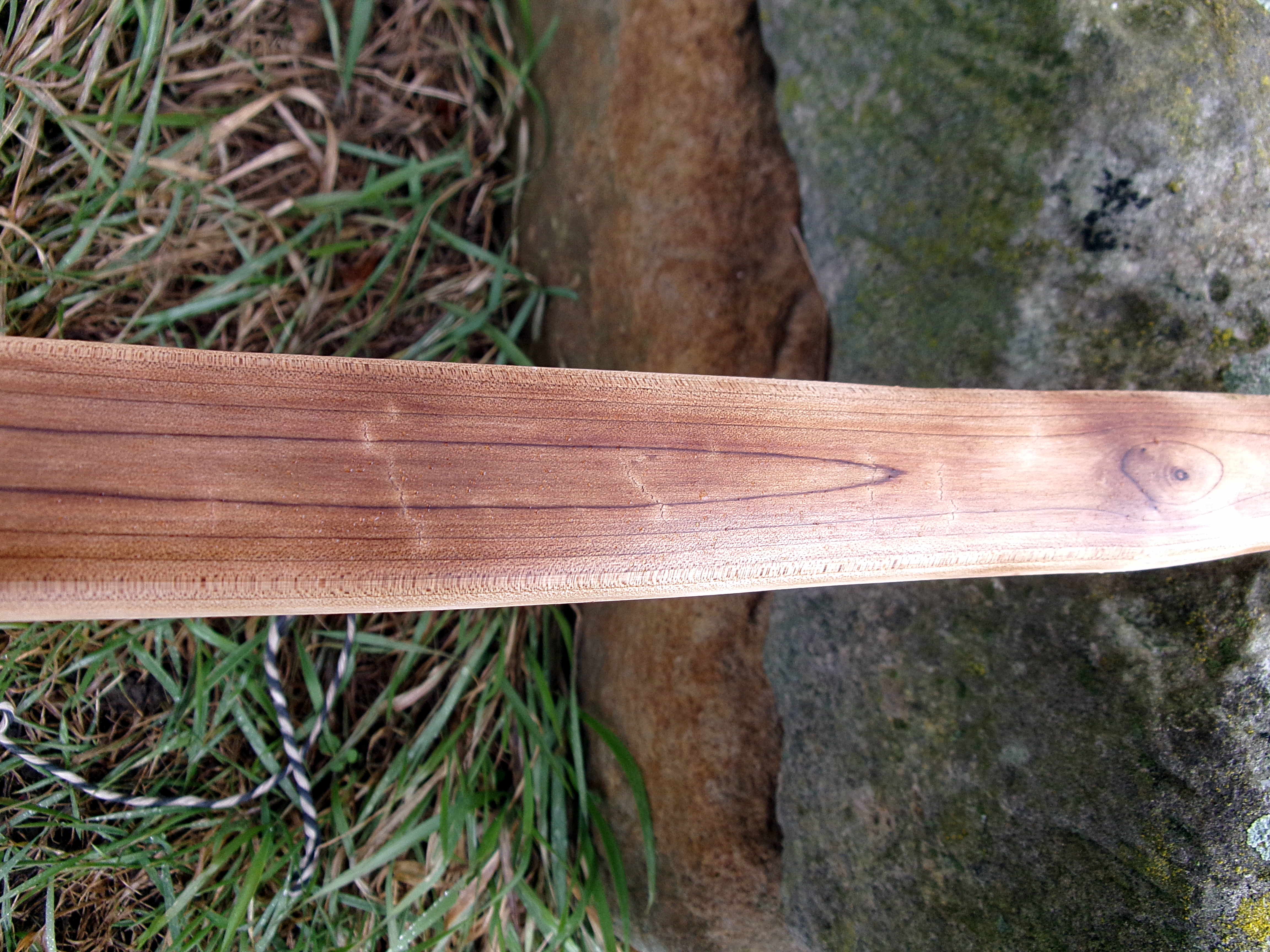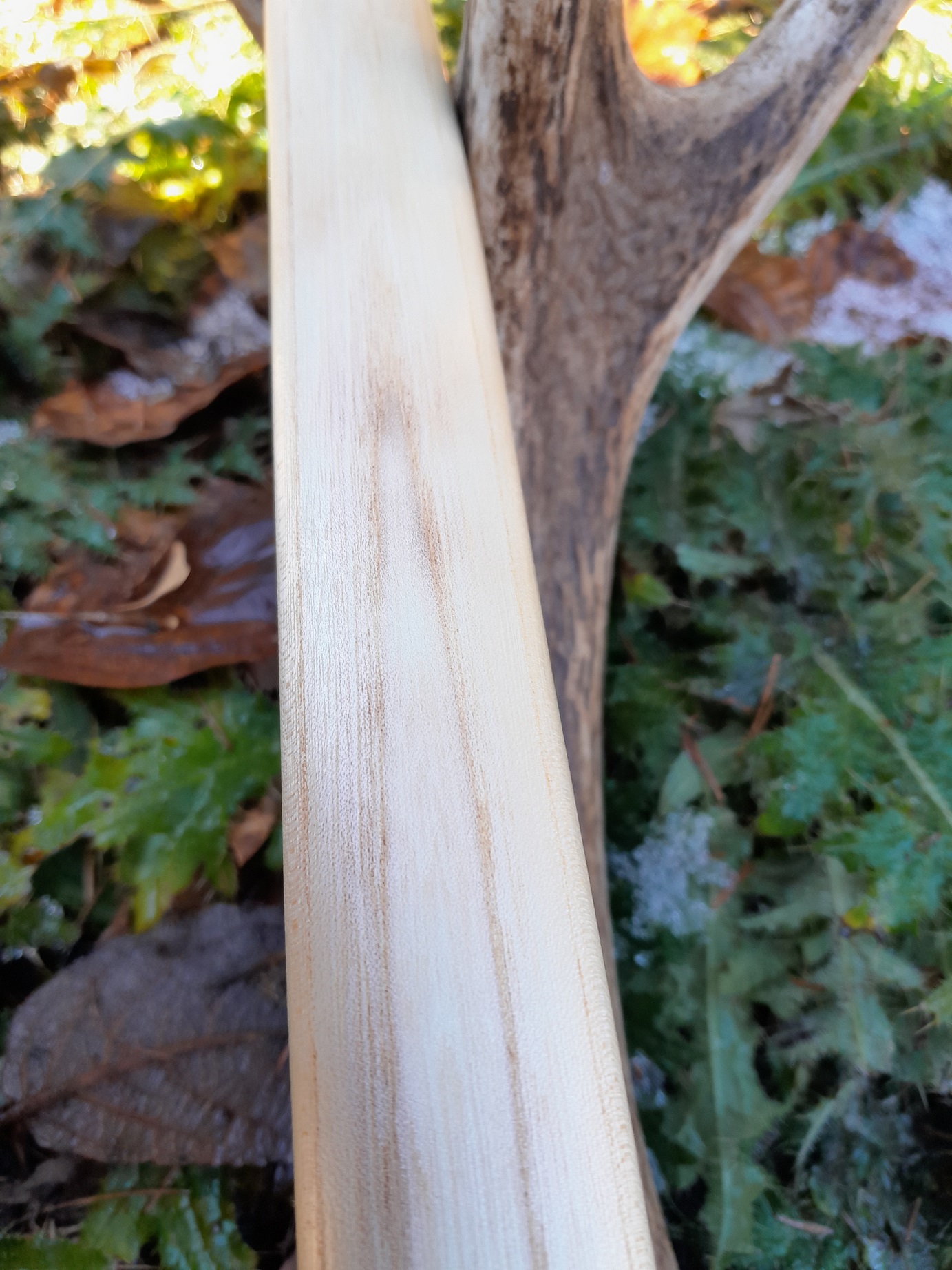 An den rötlichen Stellen war die Rinde schon vor dem fällen vermutlich wg. Fällarbeiten nicht mehr drauf. Zudem etwas Totholz und ein paar Äste. Im Griff am Bogenrücken ist ein Ast der genau zwischen den Gelenken von Ring- und Zeigefinger liegt. Und noch ein paar Details