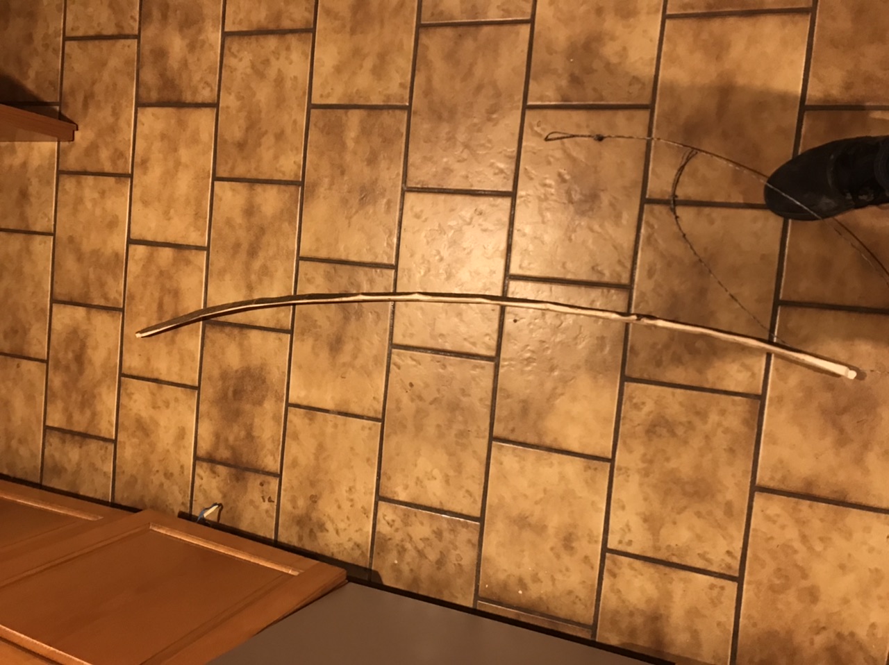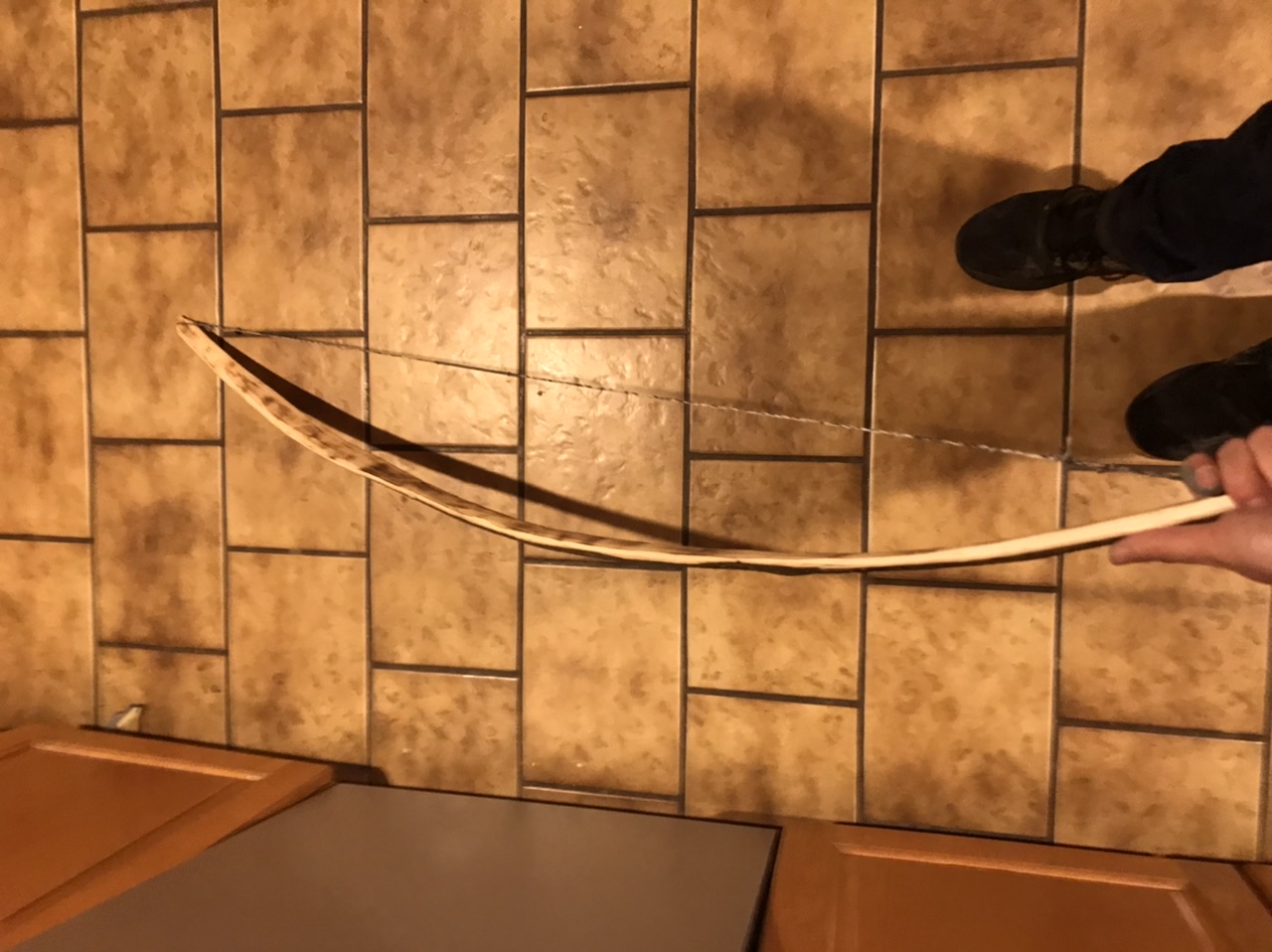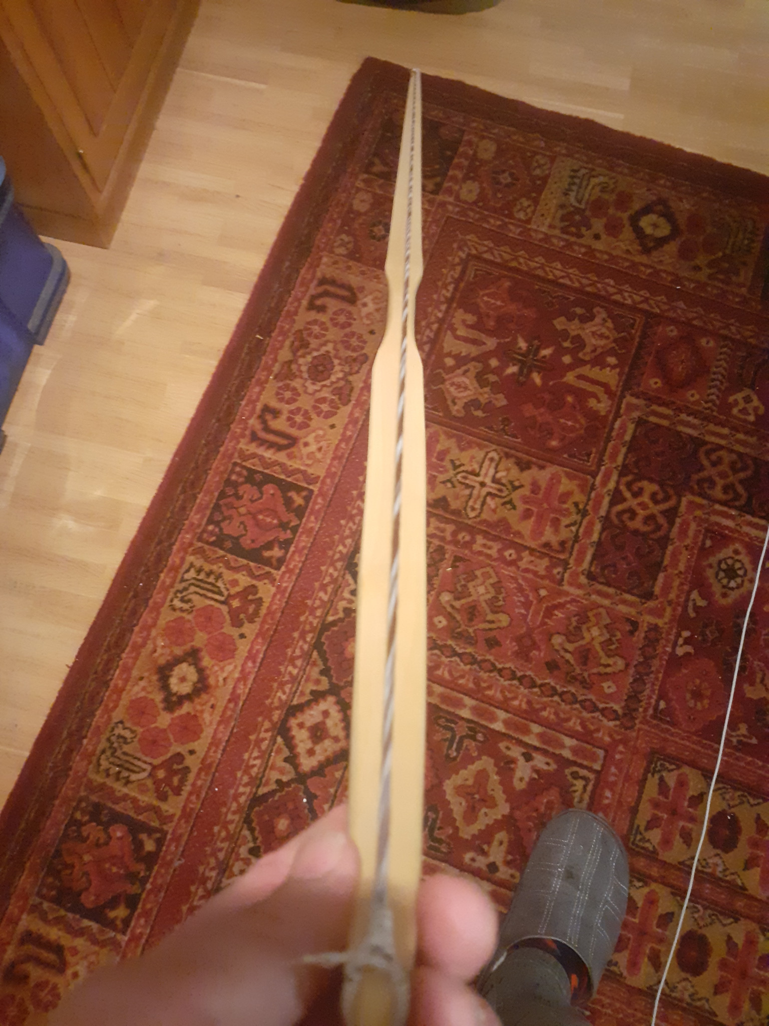 Der Tiller hat sich durch das abschließende schleifen leider verändert und biegt zu viel im Griff. Deswegen geht das Auszugbild nur bis 24" AMO (erste grüne Linie am Pfeil sind 21"). Ich muss erst noch nachtillern, bevor ich den wieder voll ausziehe. Leider geht es jetzt zum Familienessen und ich habe keine Zeit um das noch vor der Deadline zu fixen.