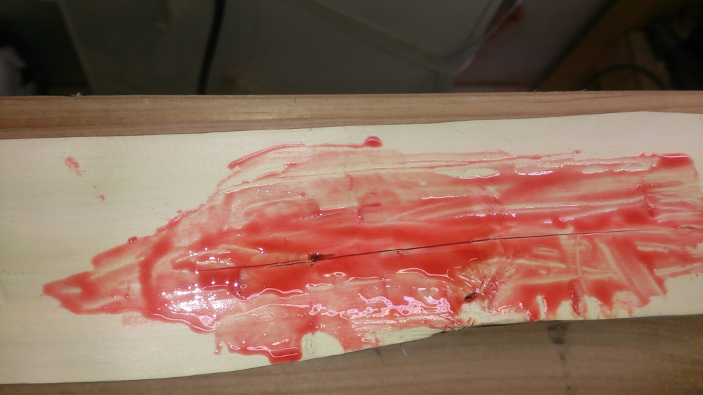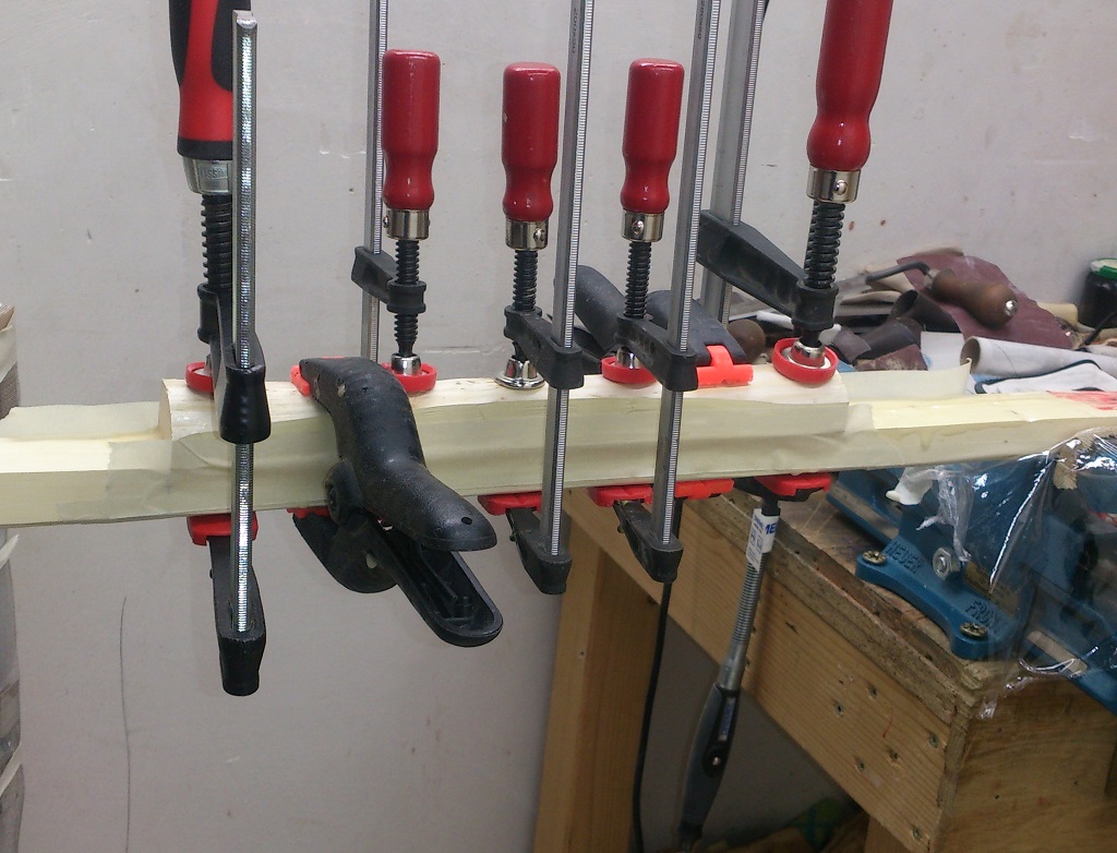Eben habe ich mal den Recurve geklebt. Dabei musste natürlich auch wieder mal was schief gehen - am Bauch iss das Holz in der Mitte, genau da wo ich nen Riss nicht brauchen kann auf ca. 6 mm Breite gerissen. Keine Ahnung wie tief der geht.