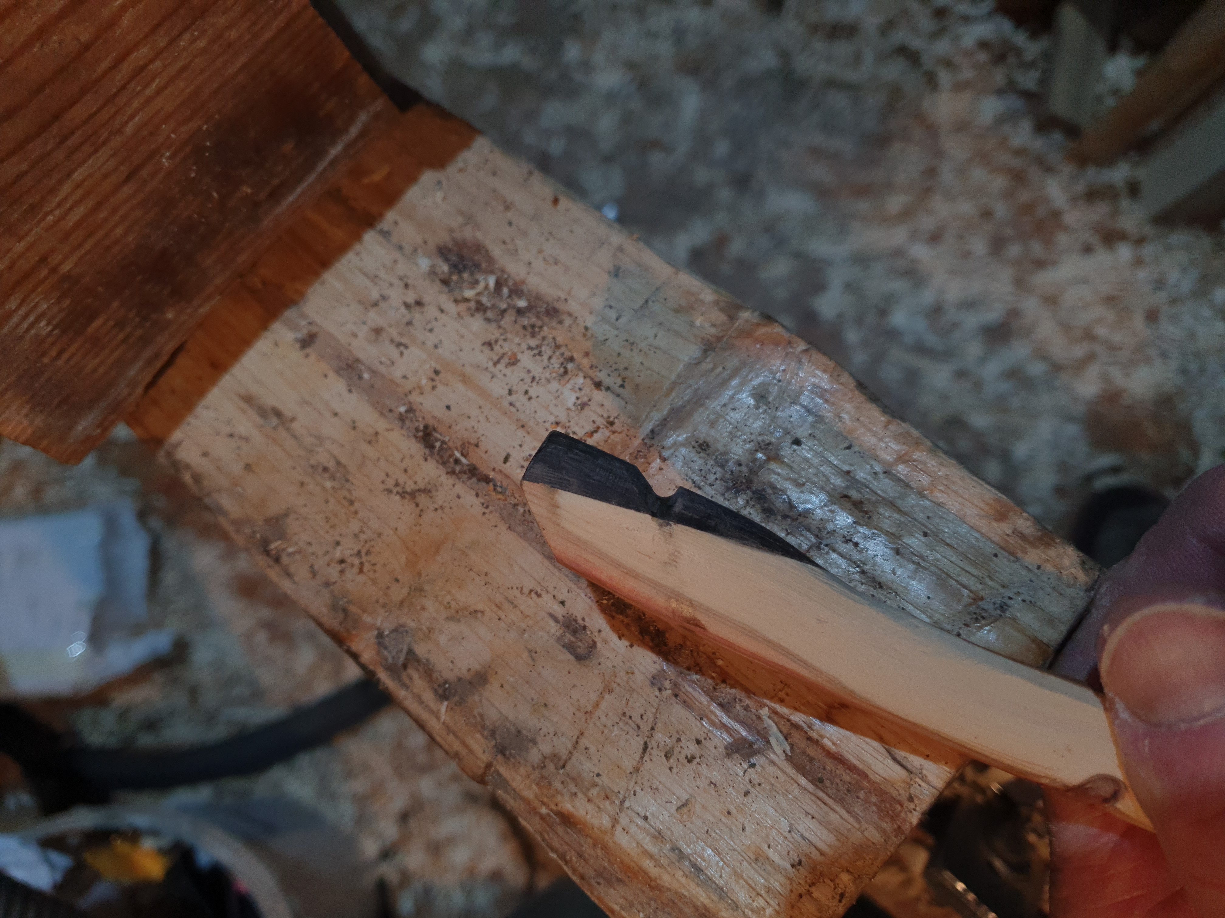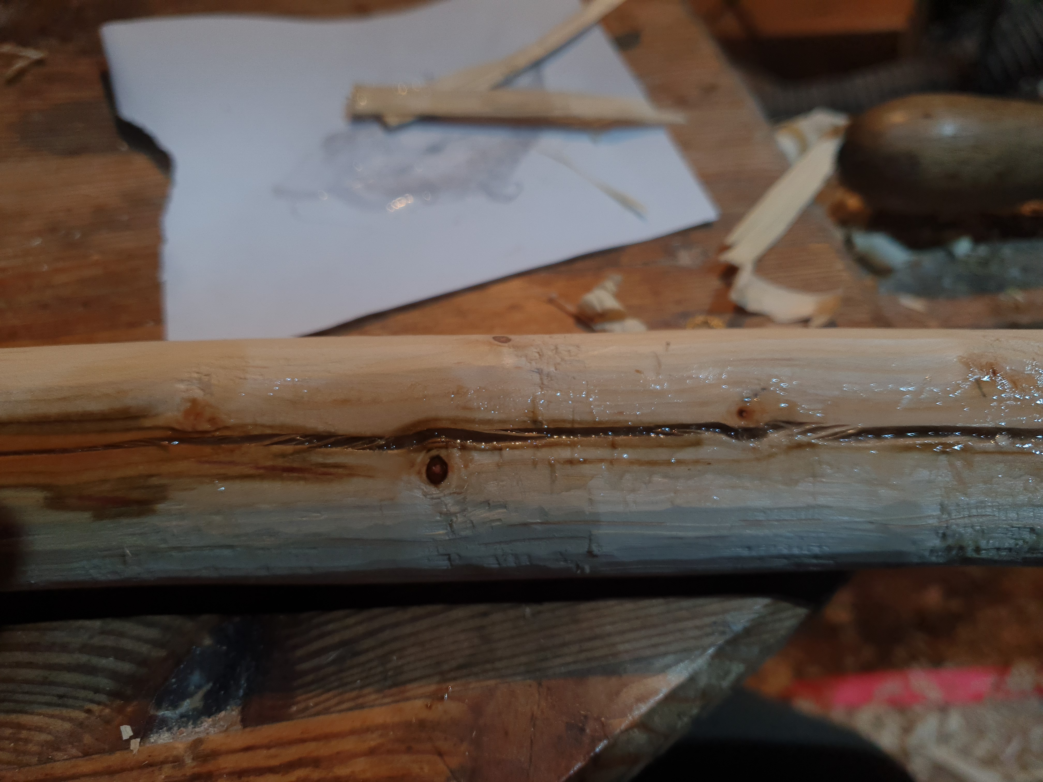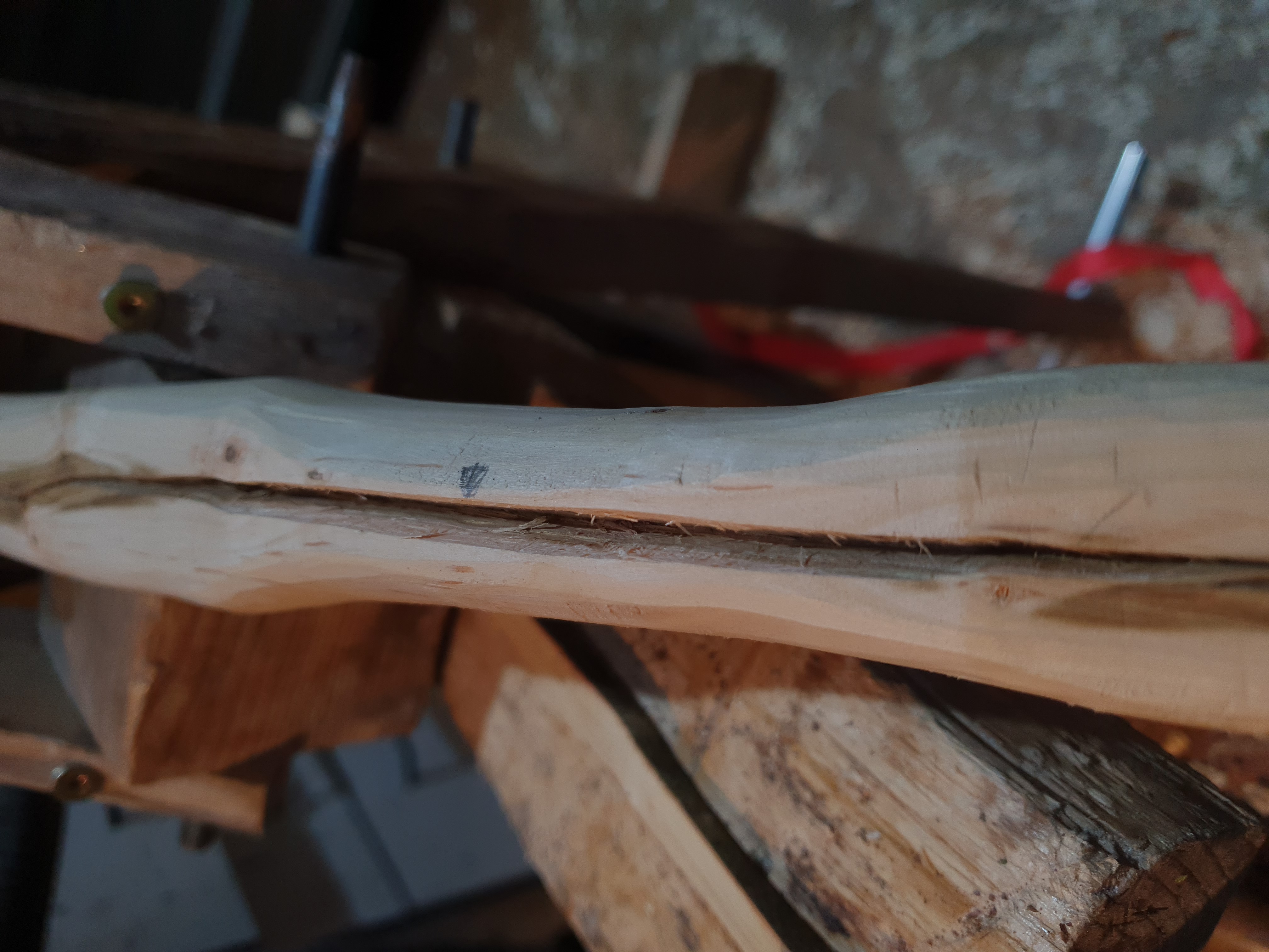 Overlays mit dem Bandschleifer in Form gebacht. Bissi getillert und den Trocknungsriss im Griffbereich mit Span und Bapp gefüllt. Den restlichen Bapp in den restlichen Riss geschmiert und Feierabend.