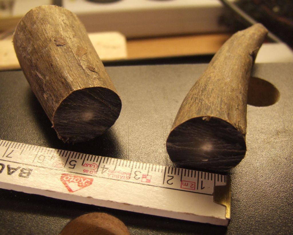 Die letzten Tage habe ich mich mit den Horn-Nocken beschäftigt (meine Ersten). Meine Hausrindhörner habe ich abgeschrieben (siehe hier) und mir ein paar massive dunkle Hörner gekauft. Um die Nocken zu bauen, habe ich mich an einer Anleitung des Users Edradour orientiert. Die Schritte im einzelnen:
