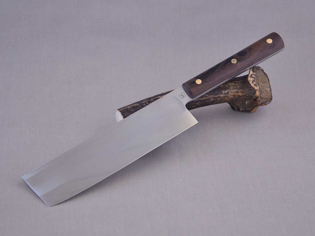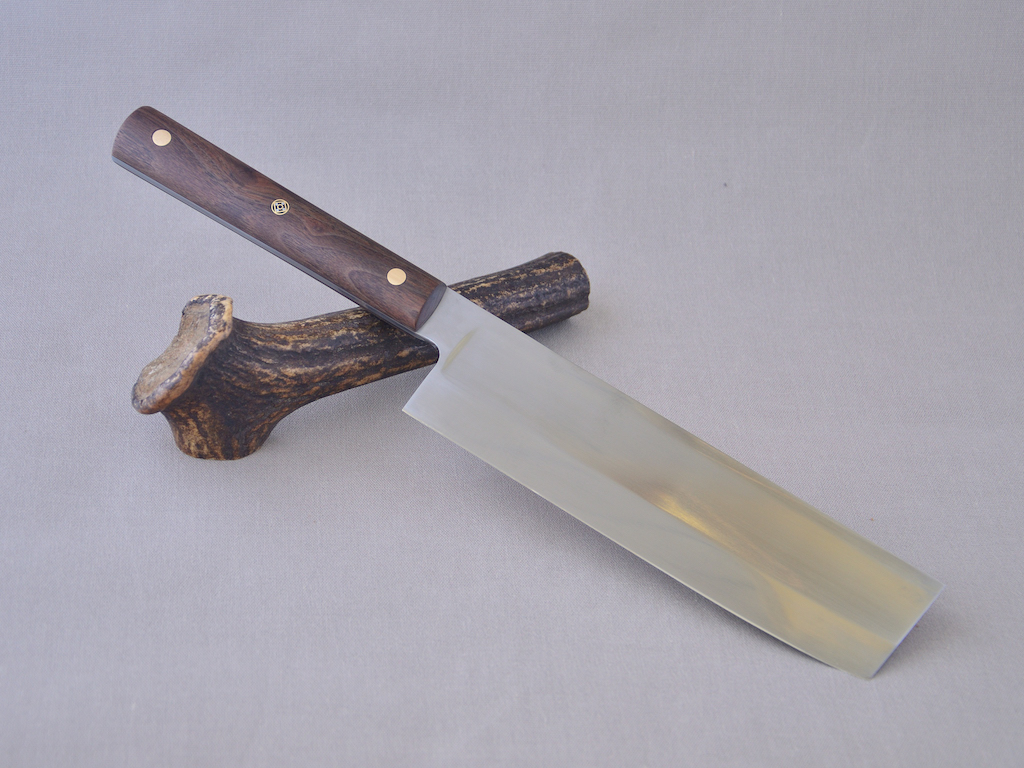 Die Klinge ist gleich groß wie das neulich vorgestellte Messer Nakiri. Ich habe zwei Klingen gemacht weil ich mich mal an einem Usuba versuchen wollte. Ich habe irgendwann meine Meinung geändert und ein Nakiri mit S-Grind gebaut. Nun die zwei Hohlungen zu schleifen ging eigentlich ganz gut. Nur habe ich diese nicht weit genug zur Schneide hin runter gezogen, d.h. die Flanken sind zu breit um den food release zu verbessern. Zudem habe ich beim finischen die Linien ziemlich verwaschen. Fragt mich bitte nicht warum ich die Klinge nicht erst mal geschärft und ausprobiert habe bevor ich den Griff angebracht habe, ich kann es nicht beantworten.