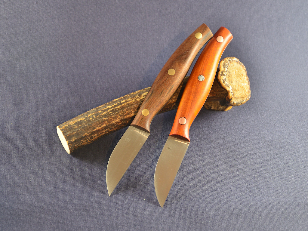 Das erste Messer hat einen Griff aus Fernambuk / Pau Brasil. Ich habe das Holz schon recht lange bei mir und kann nicht mehr sagen wo ich es her habe. Vermutlich von meinem Freund aus Brasilien aber sicher bin ich mir nicht. Sicher bin ich mir nur dass ich es nicht gekauft zu haben. Es ist mittlerweile einer der seltenen brasilianischen Hölzer und recht streng geschützt. (Das Problem sind illegale Fällungen und das verschwinden der Wälder)