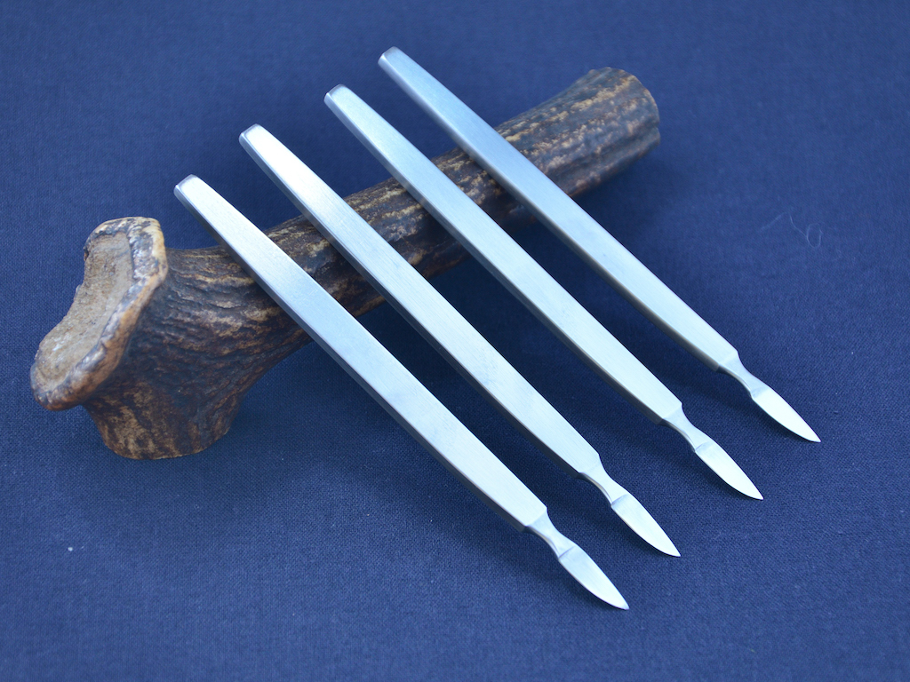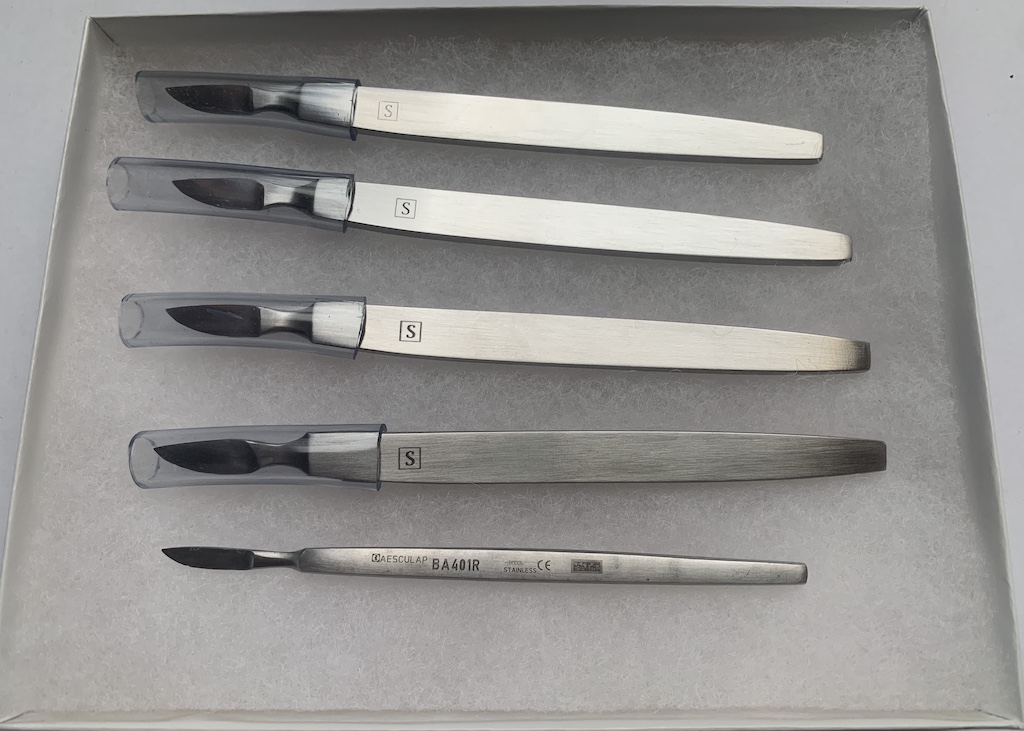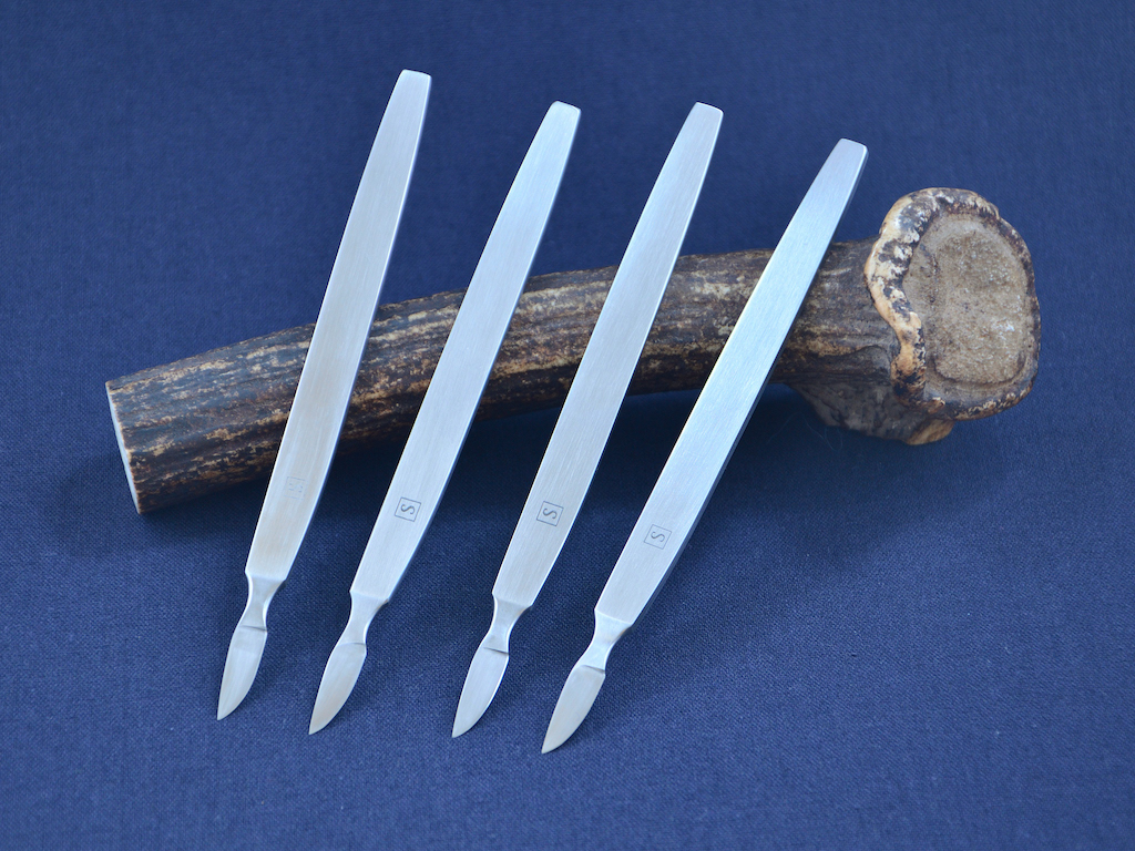 Immer wenn wir uns sehen erwähnt er dieses Geschenk und wie sehr er sich darüber gefreut hat. Dann meinte er irgendwann er baucht noch eine andere Klingenform, die spitzer ist um bei den Abdrücken feine Grate in engen Stellen zu entfernen. Er hat mir eines seiner letzten gekauften Skalpelle als Vorlage mitgegeben. Der Grundentwurf ist also nicht von mir.